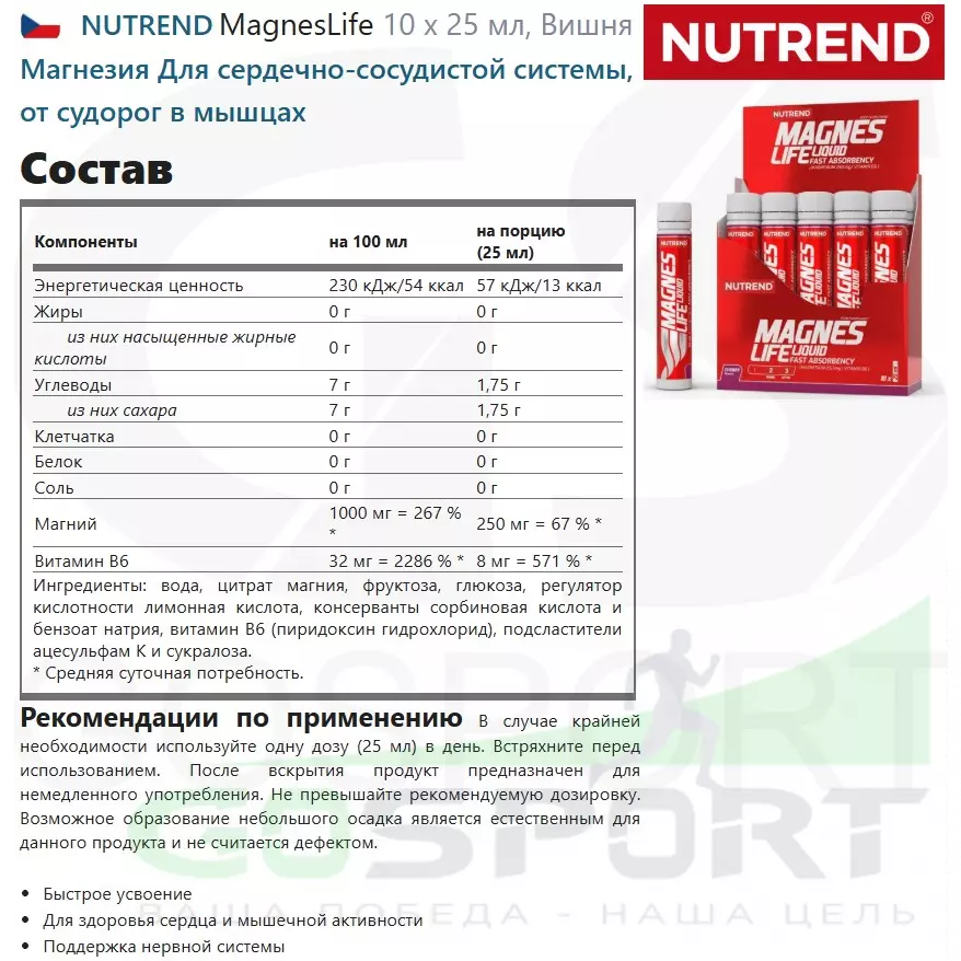 NUTREND MagnesLife 10 х 25 мл, Вишня — Магнезия Для сердечно-сосудистой системы, от судорог в мышцах