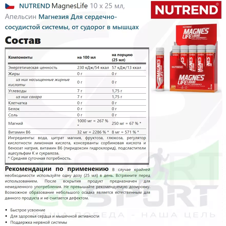 NUTREND MagnesLife 10 х 25 мл, Апельсин — Магнезия Для сердечно-сосудистой системы, от судорог в мышцах