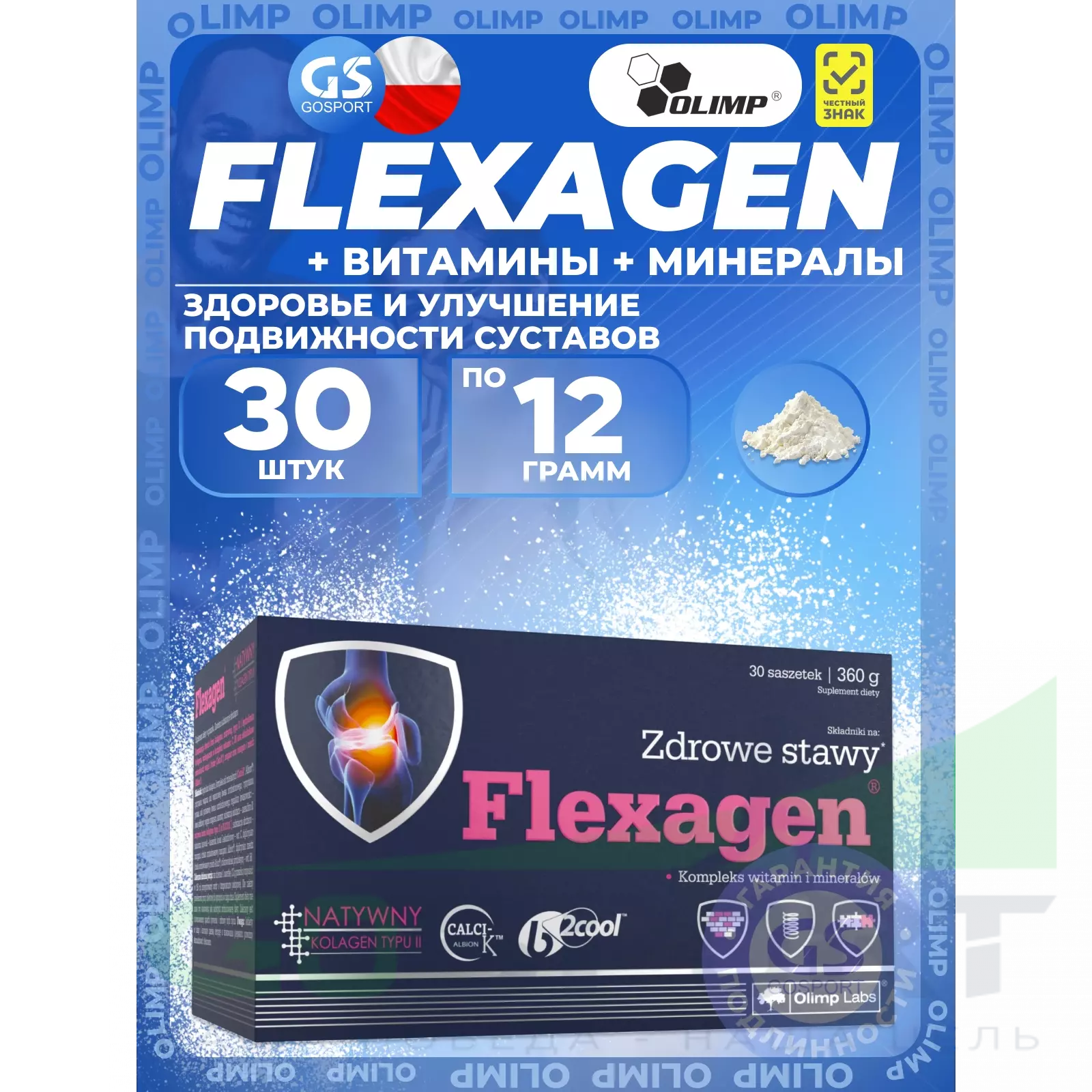 Flexagen от компании OLIMP - единственная пищевая добавка, включающая в себя натуральный коллаген II типа и гидролизат коллагена с дополнением в виде витаминов С и В6 и 6 минералов: кальция, фосфора, магния, калий, марганца и меди. Тщательно подобранный состав Flexagen обеспечивает комплексное действие этого продукта.