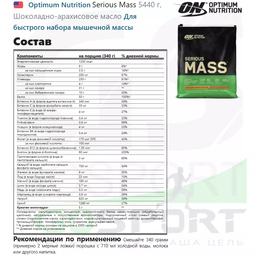 Serious Mass от компании Optimum Nutrition — это белково-углеводный продукт для набора массы. Этот многокомпонентный гейнер является комплексной высококачественной белковой смесью (сывороточный протеин, казеинат кальция, яичный альбумин). Содержит 26 витаминов и необходимых минералов, креатин, L-глютамин и пептиды. Моногидрат креатина, глютамин, холин и инозитол в составе помогают более эффективно провести тренировку. Принимать утром или во второй половине дня, до или после тренировки.