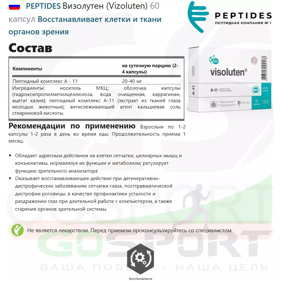 Суточная доза содержит: (2 капсулы), 20 мг пептидного комплекса А-11 (пептиды тканей глаза).