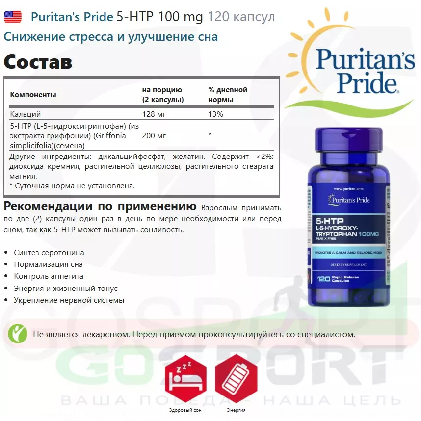 Puritan's Pride 5-HTP содержит капсулы с быстрым высвобождением.