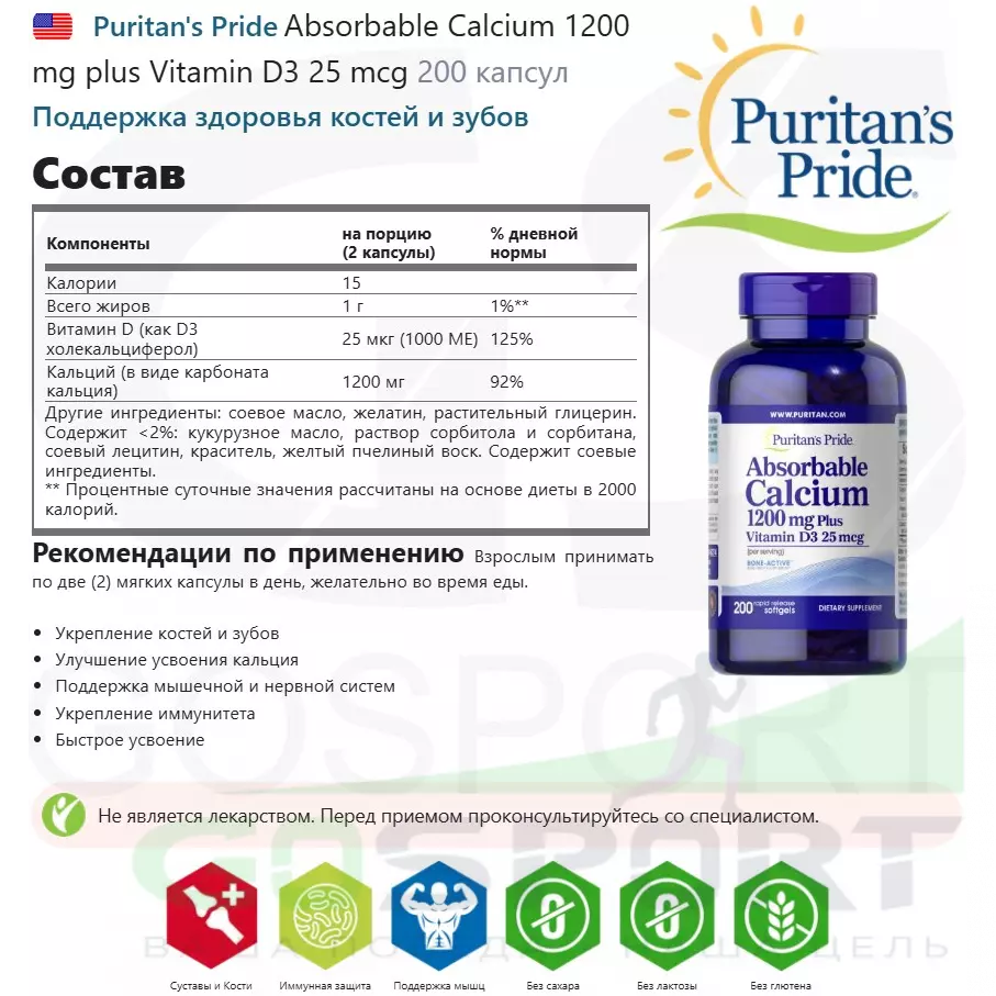 Puritan's Pride Absorbable Calcium 1200 mg plus Vitamin D3 25 mcg 200 капсул  Puritan's Pride Absorbable Calcium 1200 mg plus Vitamin D3 25 mcg 200 капсул  Puritan's Pride Absorbable Calcium 1200 mg plus Vitamin D3 25 mcg 200 капсул  Puritan's Pride Absorbable Calcium 1200 mg plus Vitamin D3 25 mcg 200 капсул  Puritan's Pride Absorbable Calcium 1200 mg plus Vitamin D3 25 mcg 200 капсул