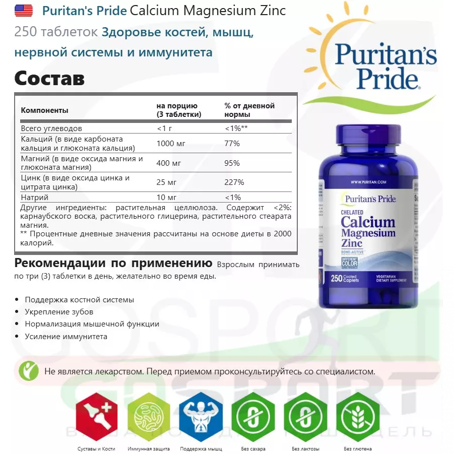 Puritan's Pride Calcium Magnesium Zinc 250 таблеток — Здоровье костей, мышц, нервной системы и иммунитета