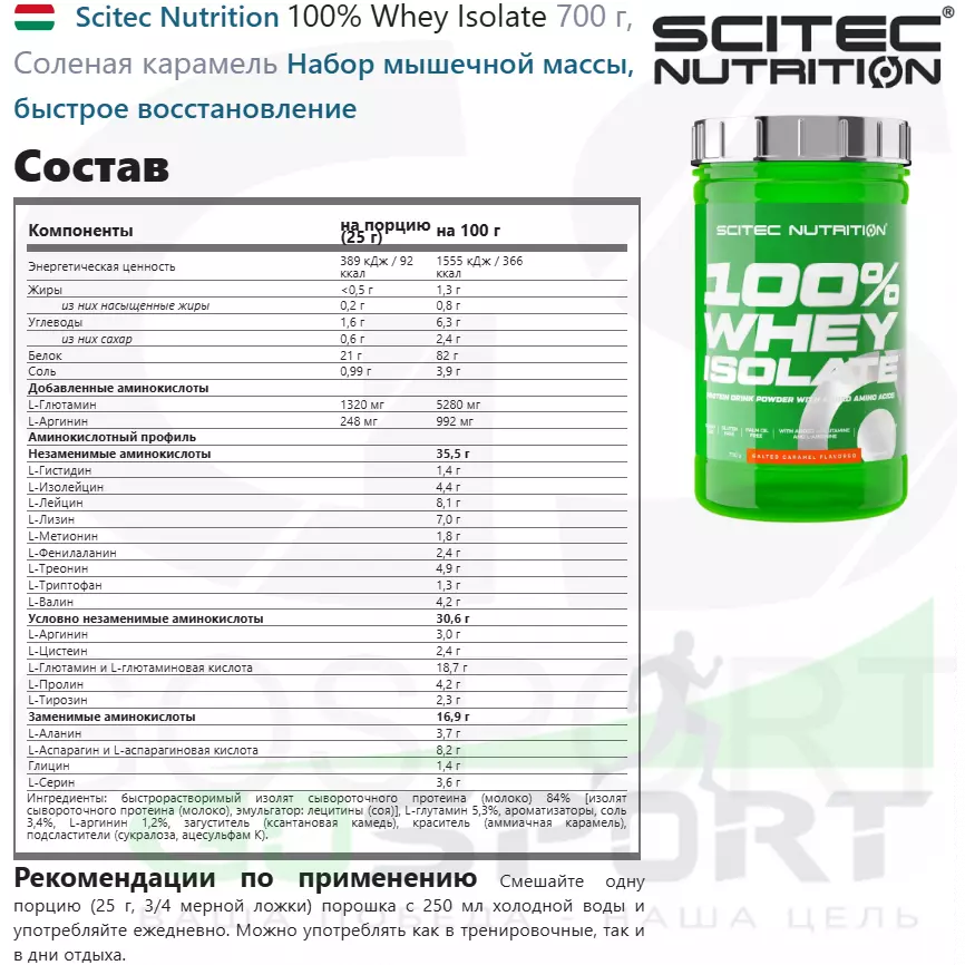 Ингредиенты: быстрорастворимый изолят сывороточного протеина (молоко) 84% [изолят сывороточного протеина (молоко), эмульгатор: лецитины (соя)], L-глутамин 5,3%, ароматизаторы, соль 3,4%, L-аргинин 1,2%, загуститель (ксантановая камедь), краситель (аммиачная карамель), подсластители (сукралоза, ацесульфам К).
