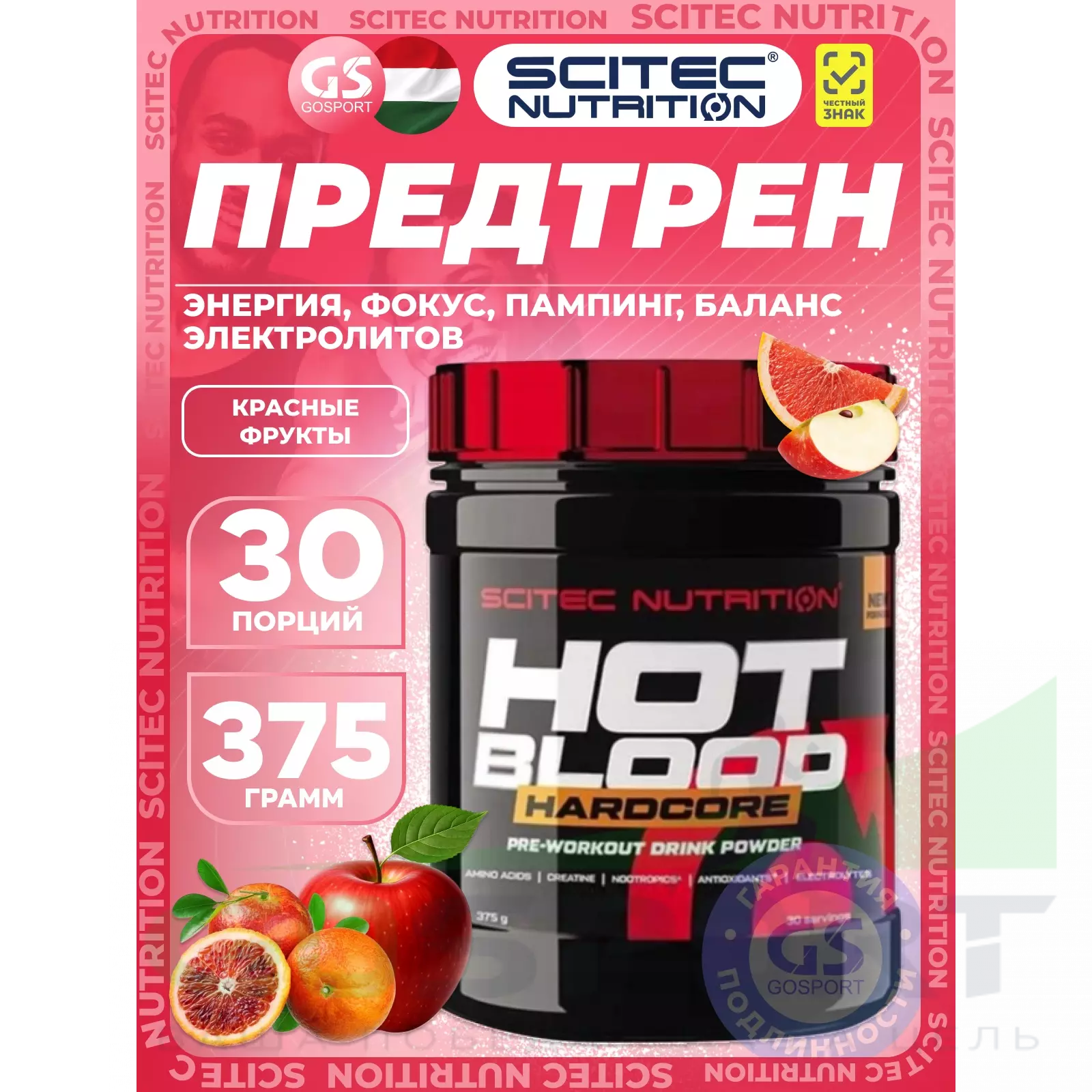 Scitec Nutrition Hot Blood Hardcore 375 г, Красные фрукты — Энергия, фокус, пампинг, баланс электролитов
