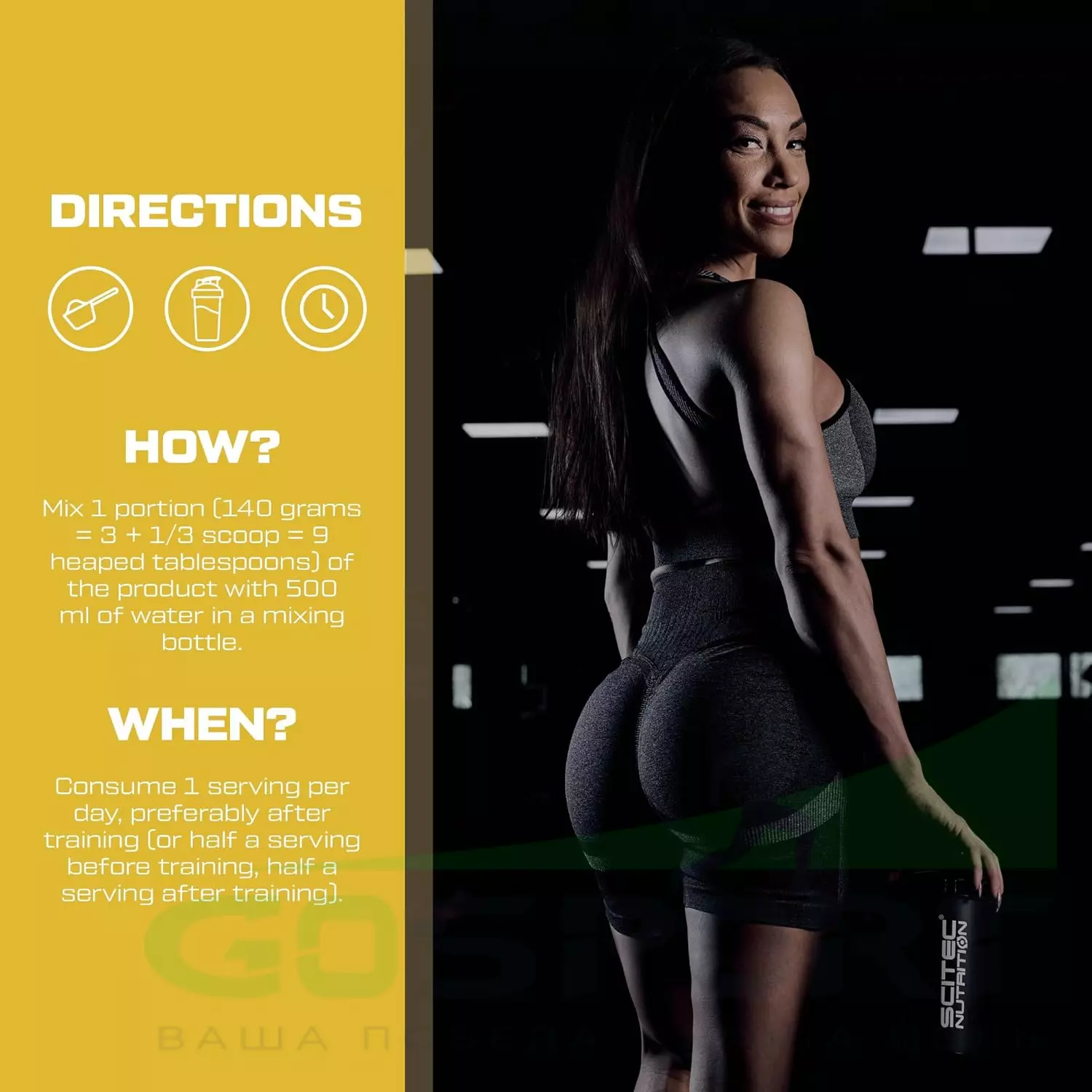 Смешайте 1 порцию (140 грамм = 3 + 1/3 мерных ложки = 9 полных столовых ложек) продукта с 500 мл воды в емкости для смешивания. Употребляйте 1 порцию в день, предпочтительно после тренировки (или половину порции до и половину порции после тренировки).