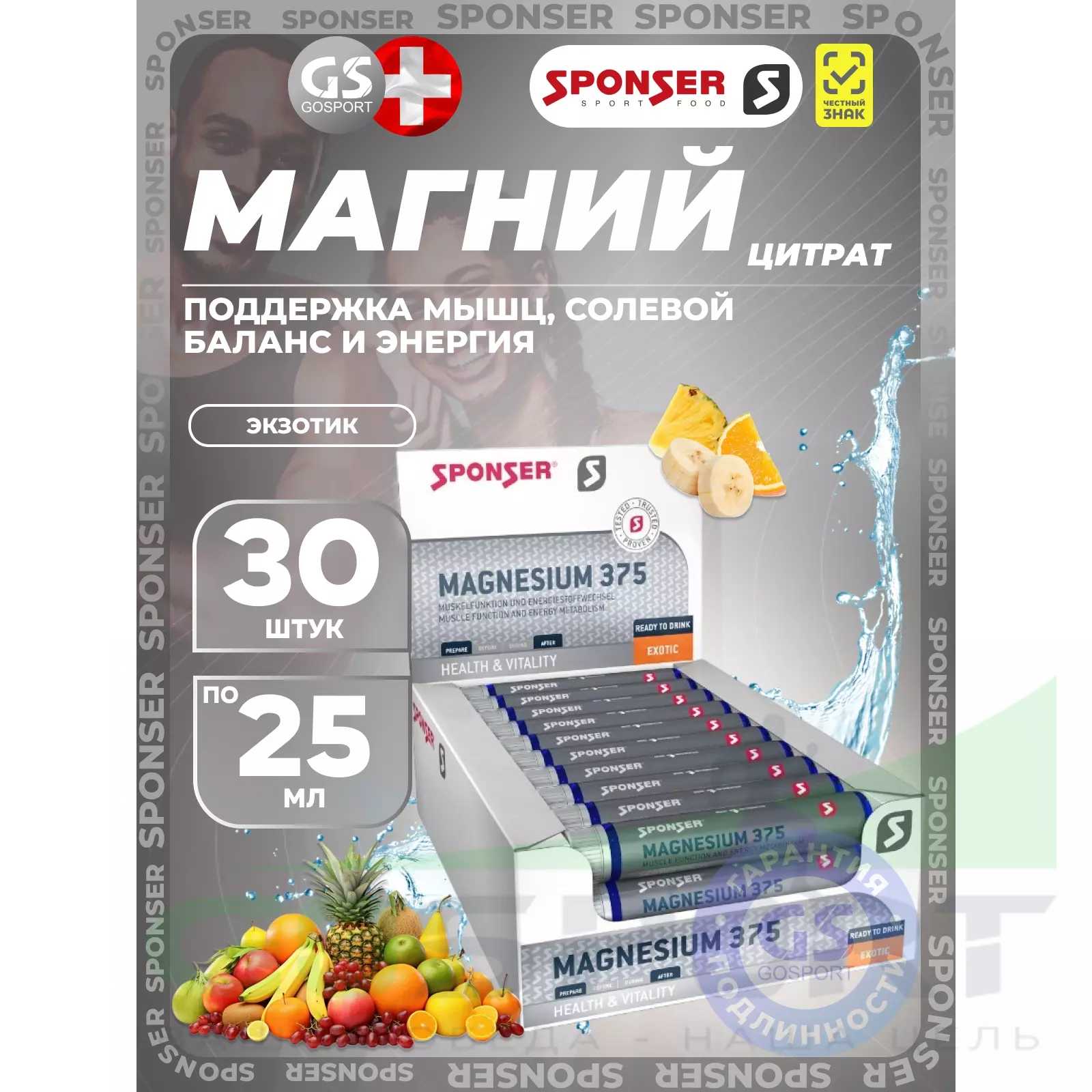 SPONSER Magnesium 375 экзотик - ампулы с высоким содержанием магния 375мг и витаминами, со вкусом экзотик. Эти три компонента способствуют уменьшению усталости и истощения, поддерживают функции мышц, баланс электролитов и энергетический метаболизм.