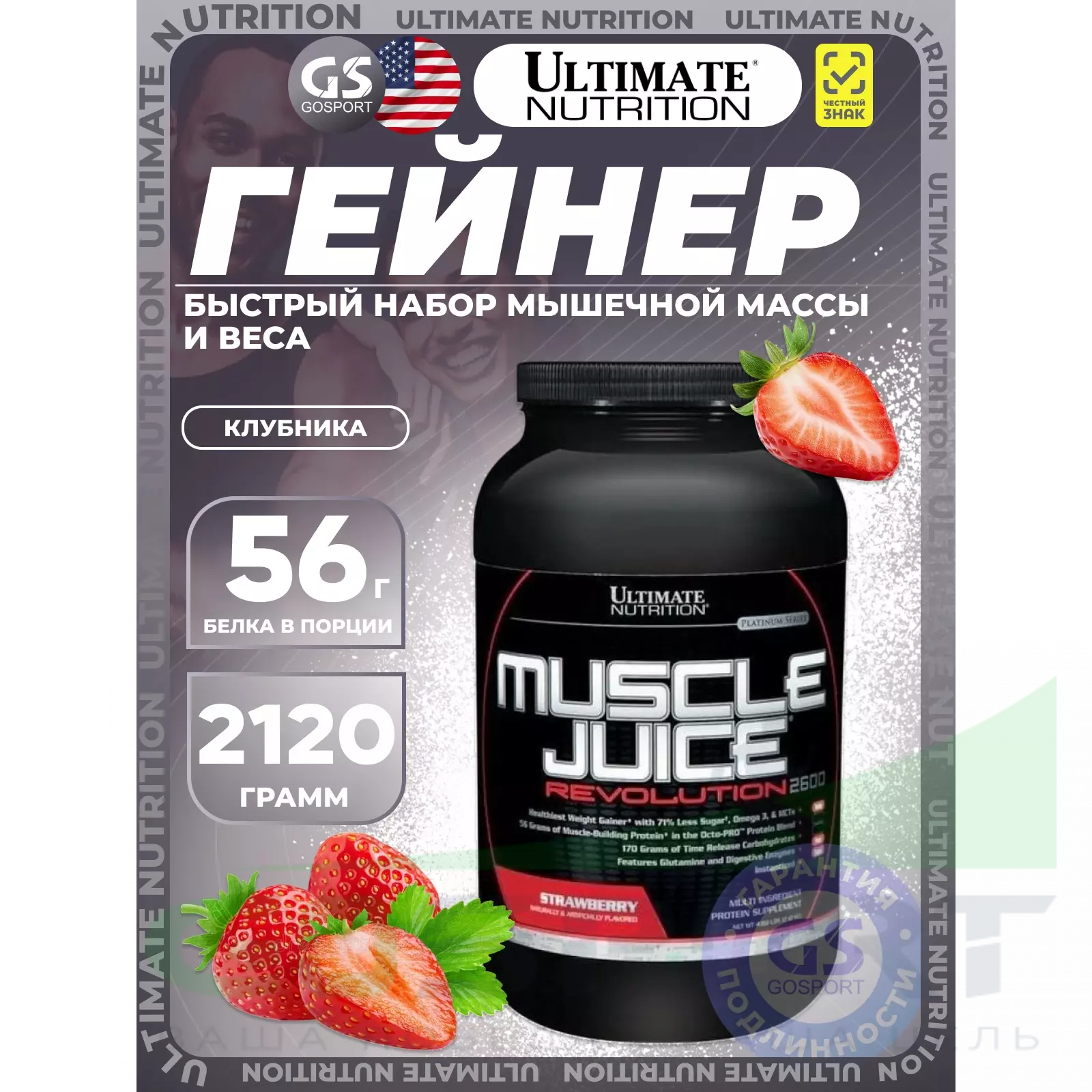 Muscle Juice Revolution – это новый продукт от компании Ultimate Nutrition в категории питания для набора массы. Эго отличие от других продуктов заключается в содержании 56 граммов белка (из расчета на одну порцию) в уникальной Octo-PRO™ протеиновой смеси. Приставка «Octo» говорит о содержании в данной смеси 8ми!!! различных протеинов, включая: концентрат сывороточного белка, изолят сывороточного белка, изолят молочного белка, гидролизат сывороточного белка, изолят яичного белка, мицеллярный казеин, концентрат молочного белка, казеинат кальция. Кроме того, для сведения к минимуму риска вздутия живота в процессе переваривания углеводов в Muscle Juice Revolution 2600 добавлено 175 грамм долго-усваиваемых углеводов. На этом новшества в данном продукте не заканчиваются: в формулу Muscle Juice Revolution 2600 вместо обычного глютамина входит 1000 мг глютаминовой смеси с добавлением L-аланил-L-глютамин – мощного дипептида, способного защитить от катаболизма мышечных тканей, а также снабдить ваши мышцы необходимым топливом в периоды продолжительных тренировок. Принимая по две порции в течения дня, ваш организм получает более 2600 калорий и более 146 граммов белка, приближая вас к заветной цели по набору массы.