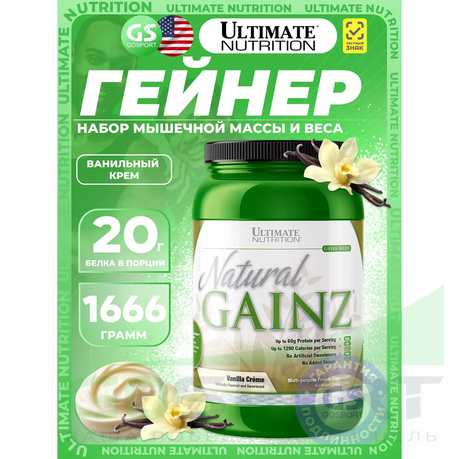 Бодибилдерам, спортсменам и любителям фитнеса нужна формула, разработанная для увеличения сухой мышечной массы и восстановления организма после интенсивных тренировок. Natural Gainz от Ultimate Nutrition предлагает эти и многие другие преимущества. Эта передовая формула содержит 860 калорий и комбинацию основных питательных веществ: 40 г белка из нескольких источников, 9 г полезных жиров, 189 г высококачественных углеводов и 5 г пищевых волокон.