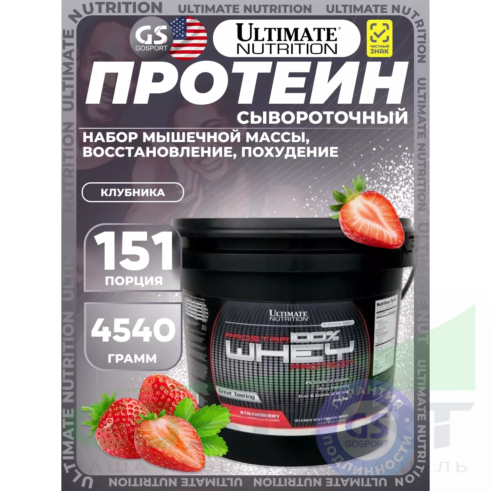 Для удовлетворения потребностей спортсменов компания Ultimate Nutrition разработала продукт 100% Prostar Whey Protein с содержанием всего перечня заменимых и незаменимых аминокислот, необходимых для строительства вашей мускулатуры как при длительных, так и непродолжительных интенсивных нагрузках. 100% Prostar Whey Protein – это уникальное сочетание всех питательных веществ, включая фактор иммунного роста, получаемый с использованием специальных процессов из сывороточного белка. Поскольку упражнения могут нанести урон вашей иммунной систем, 100% Prostar Whey Protein выбор тех, кто придерживается активного образа жизни, независимо являетесь ли вы любителем или профессионалом.