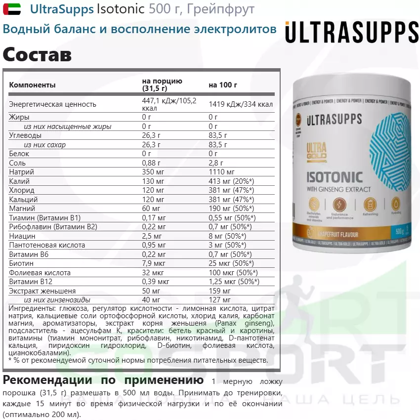 Спортивная добавка Ultra Gold Isotonic — изотонический напиток для поддержания водно-солевого баланса. Продукт помогает восполнить баланс электролитов, который нарушается в процессе интенсивных тренировок. Напиток содержит идеальное для спортсменов чистое соотношение углеводов, минералов, электролитов, витаминов группы B. Он дополнительно усилен экстрактом женьшеня, который стимулирует здоровую работу нервной системы, способствует повышению работоспособности и общего энергетического уровня.