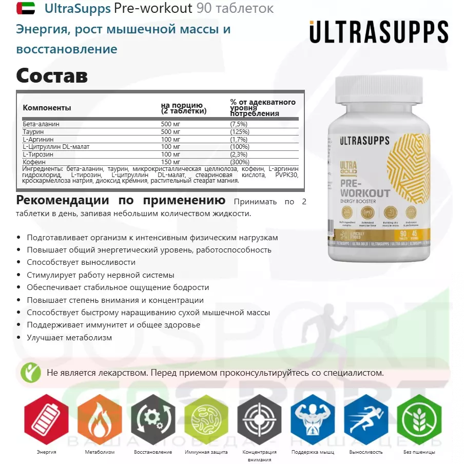 UltraSupps Pre-workout 90 таблеток — Энергия, рост мышечной массы и восстановление