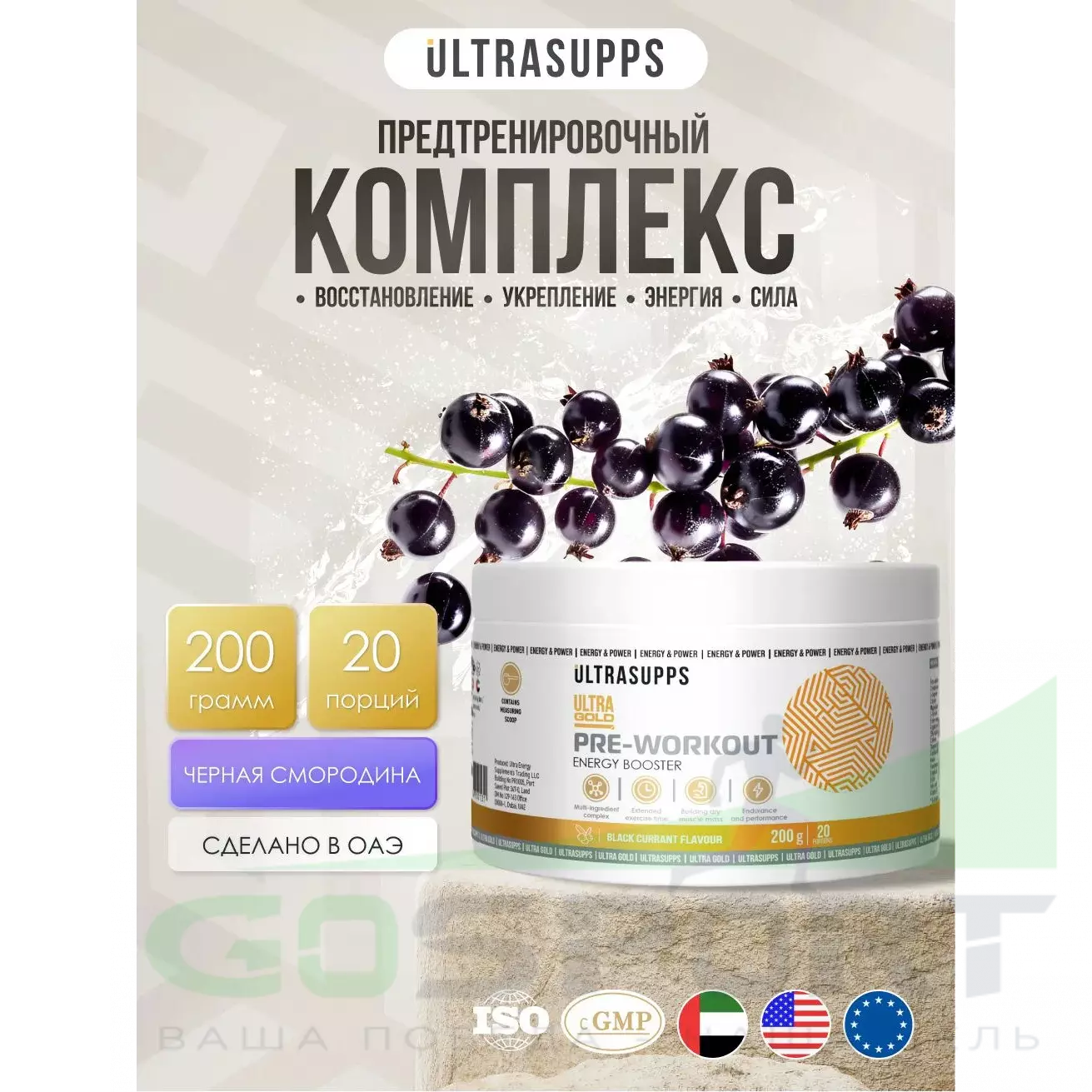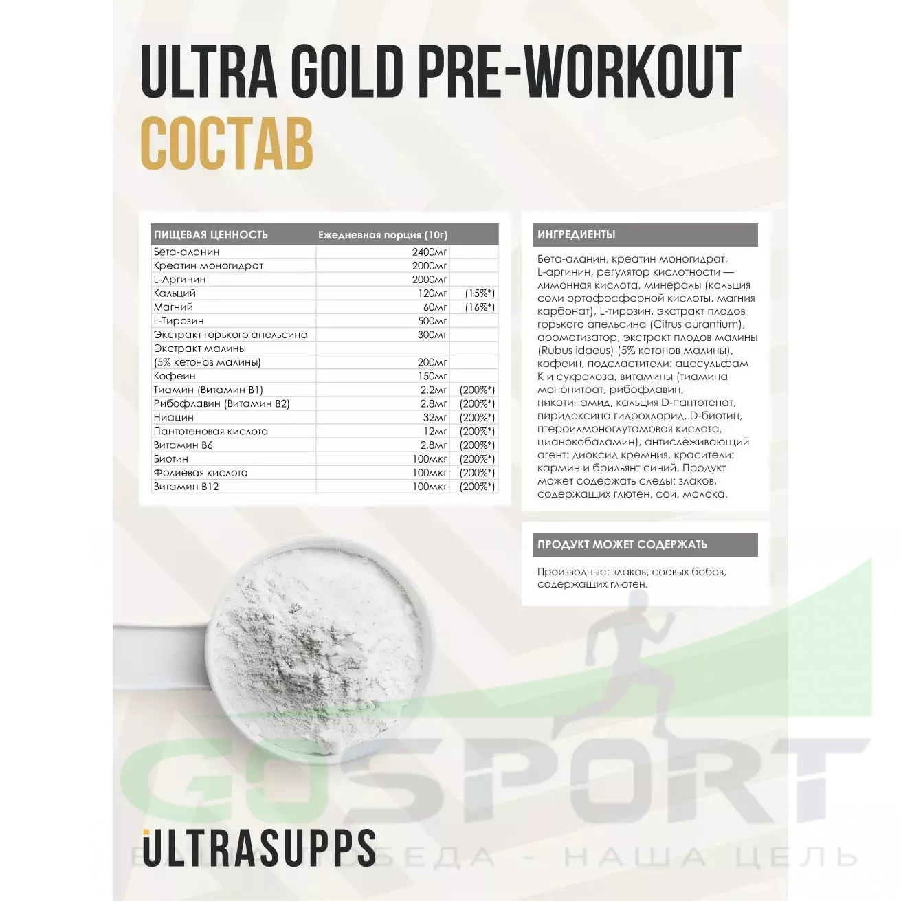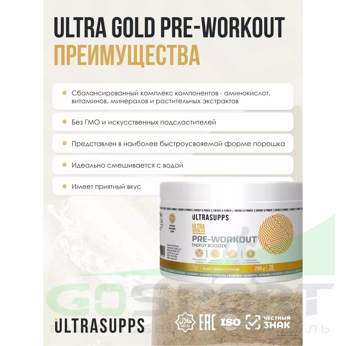 Серия спортивных добавок Ultra Gold разработана международным брендом Ultrasupps из ОАЭ специально для продуктивных тренировок и быстрого восстановления. Продукты подходят как профессиональным спортсменам, так и всем, кто занимается фитнесом. Ultrasupps использует в производстве только лучшее сырье премиального качества от известных производителей. Все компоненты продуктов тщательно протестированы.