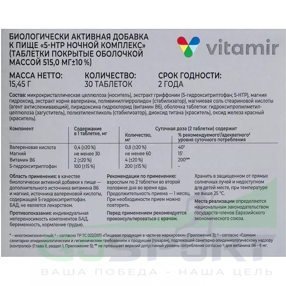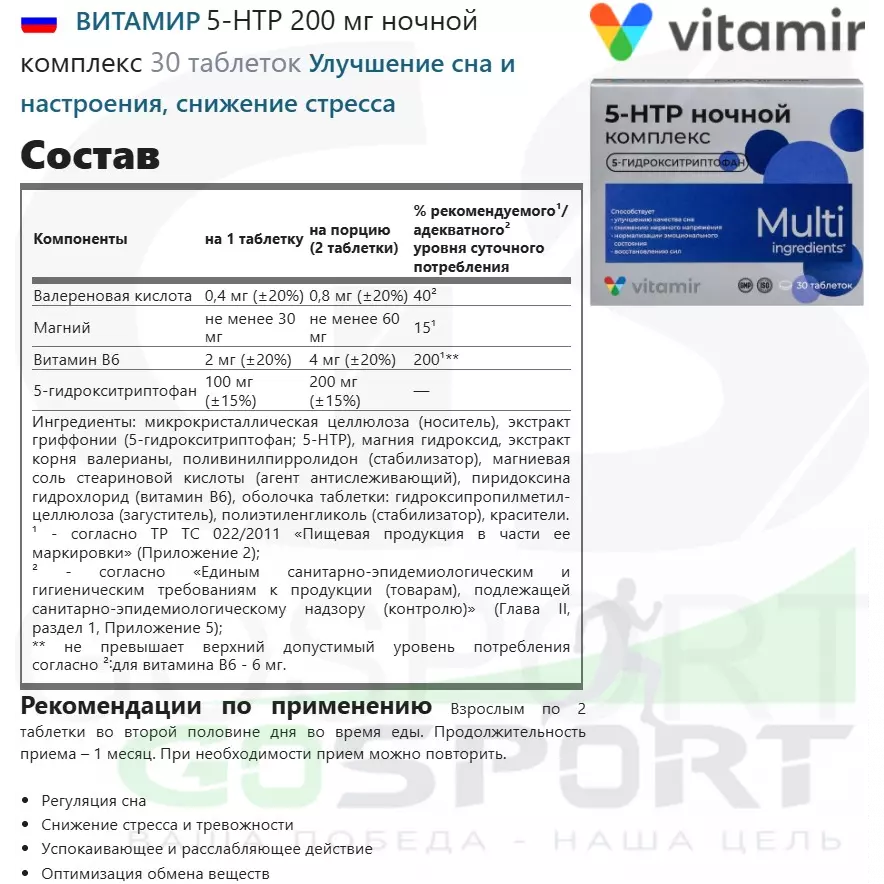 ВИТАМИР 5-HTP 200 мг ночной комплекс 30 таблеток — Улучшение сна и настроения, снижение стресса