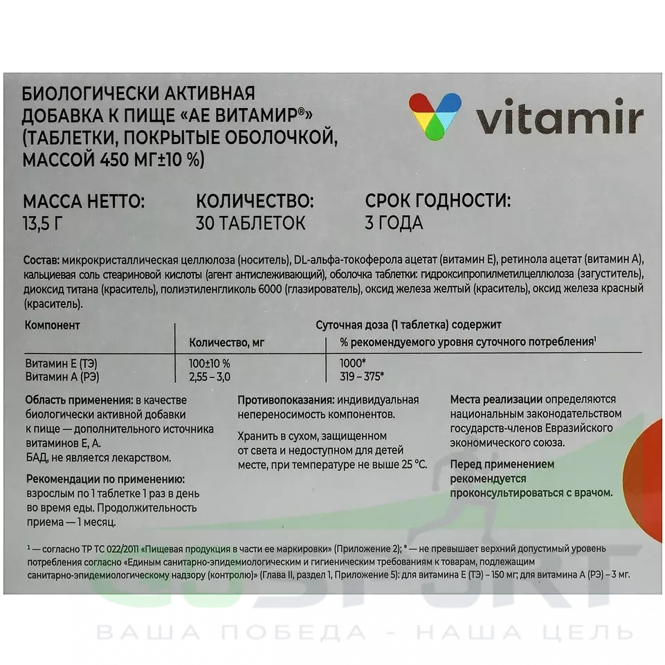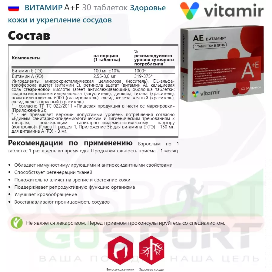 Ингредиенты: микрокристаллическая целлюлоза (носитель), DL-альфа-токоферола ацетат (витамин Е), ретинола ацетат (витамин А), кальциевая соль стеариновой кислоты (агент антислеживающий), оболочка таблетки: гидроксипропилметилцеллюлоза (загуститель), диоксид титана (краситель), полиэтиленгликоль 6000 (глазирователь), оксид железа желтый (краситель), оксид железа красный (краситель).