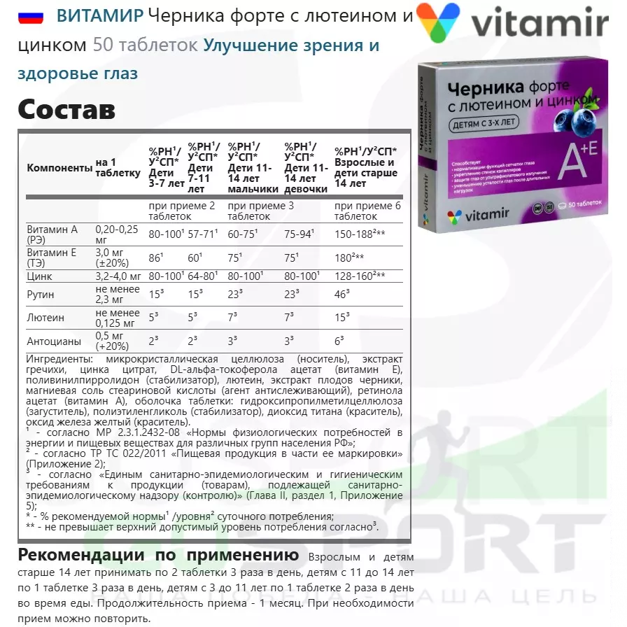 ВИТАМИР Черника форте с лютеином и цинком 50 таблеток — Улучшение зрения и здоровье глаз
