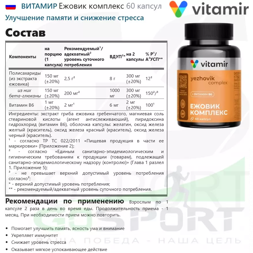 Ежовик комплекс VITAMIR - это биологически активная добавка с экстрактом ежовика гребенчатого в капсулах, разработанная для поддержки мозга, нервной системы и общего психоэмоционального состояния.