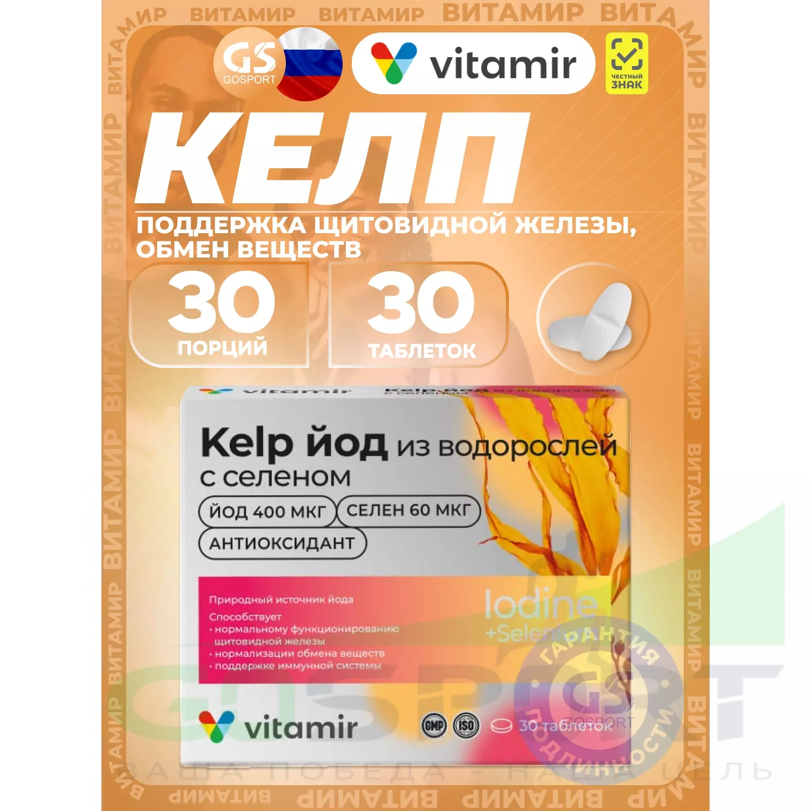 ВИТАМИР KELP йод из водорослей с селеном 30 таблеток — Поддержка щитовидной железы, обмен веществ