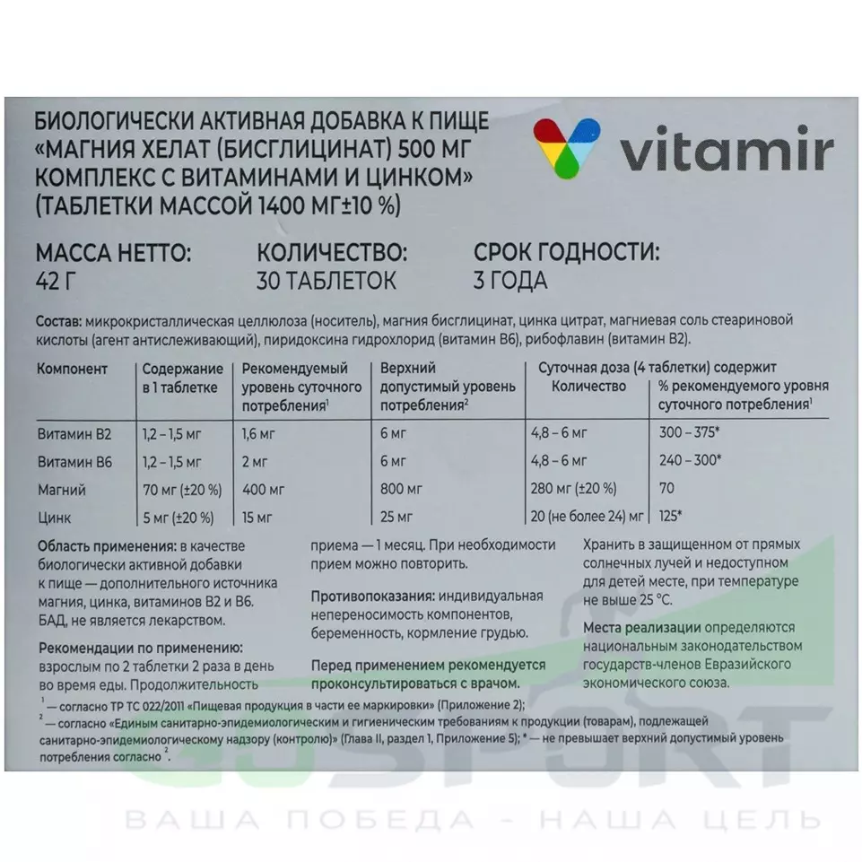 Описание ВИТАМИР Магния хелат 500 мг комплекс