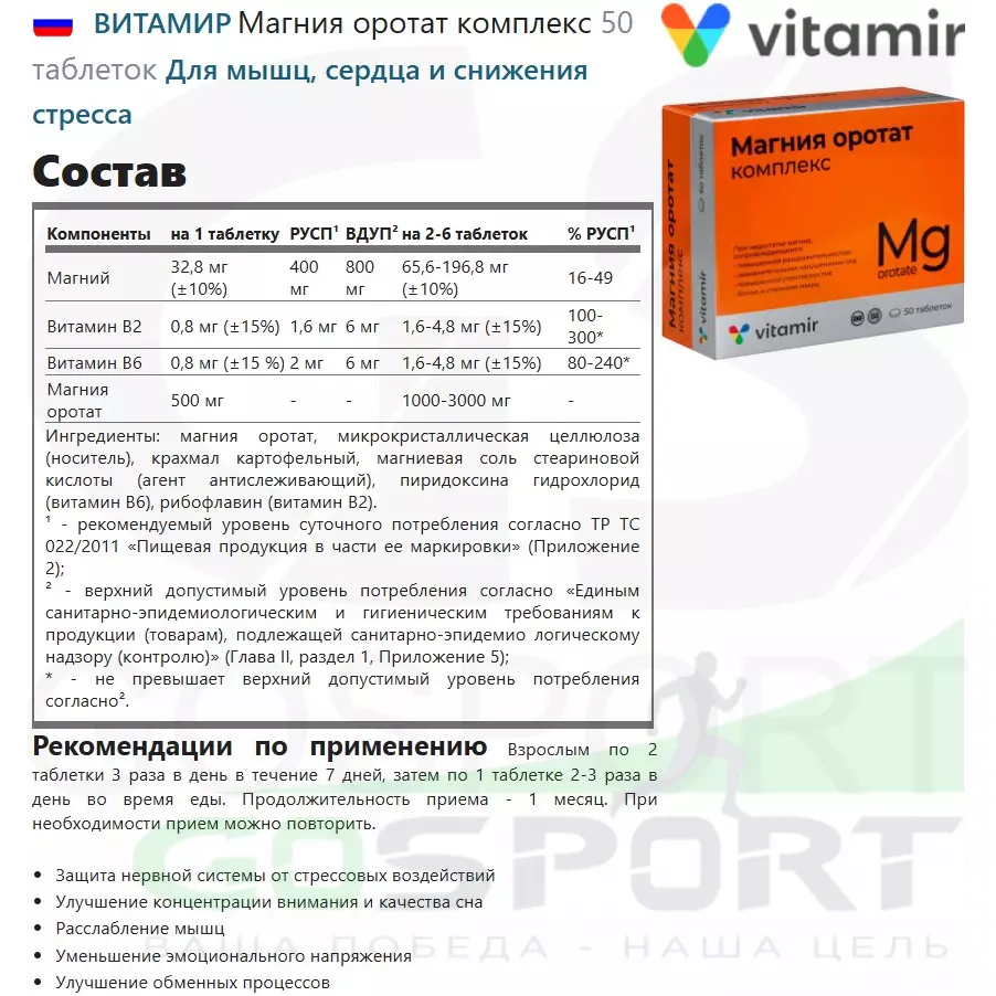 Ингредиенты: магния оротат, микрокристаллическая целлюлоза (носитель), крахмал картофельный, магниевая соль стеариновой кислоты (агент антислеживающий), пиридоксина гидрохлорид (витамин В6), рибофлавин (витамин В2).