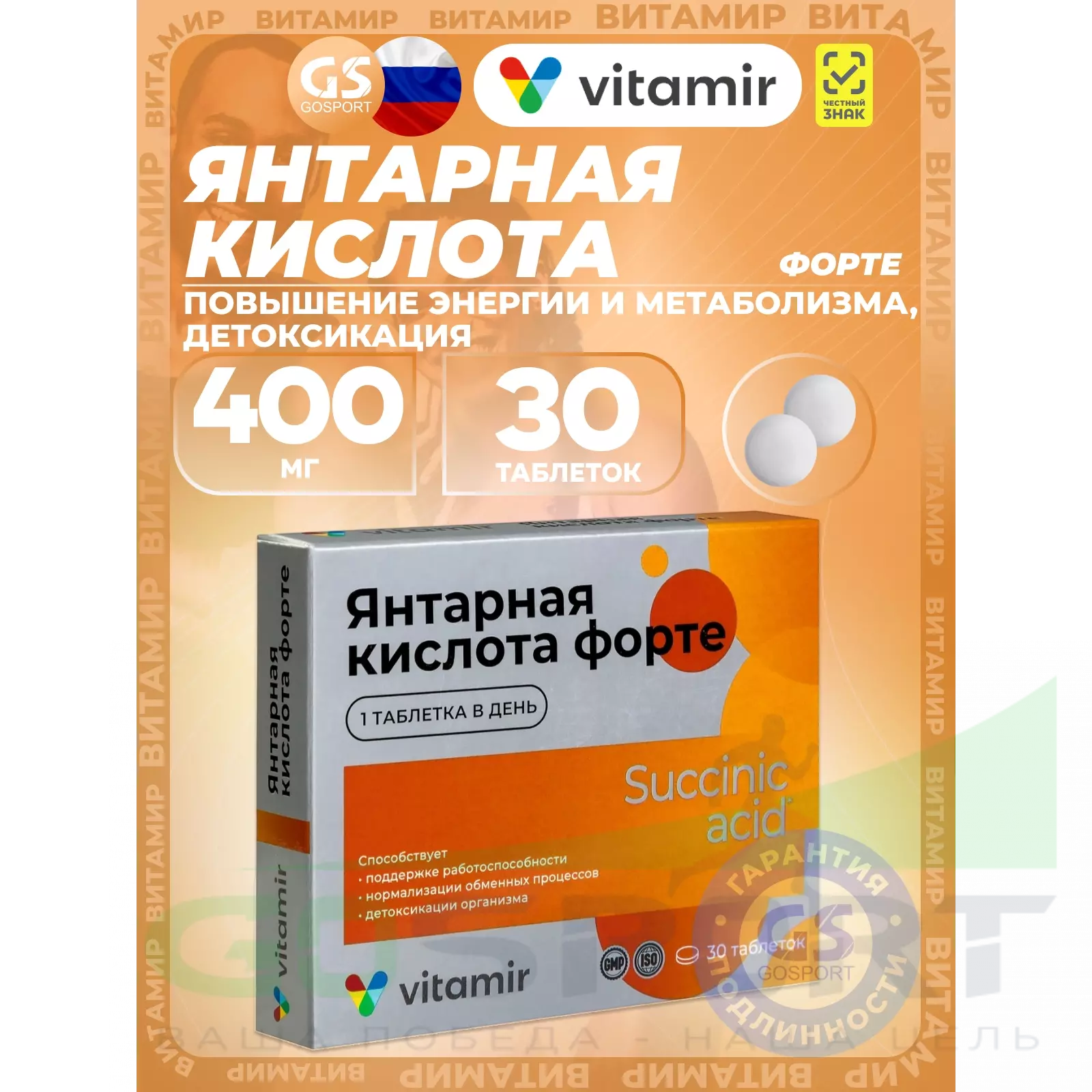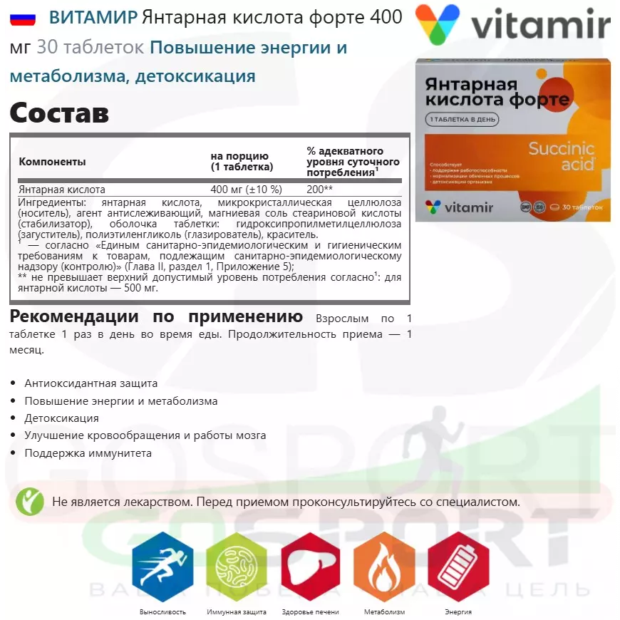 ВИТАМИР Янтарная кислота форте 400 мг 30 таблеток — Повышение энергии и метаболизма, детоксикация