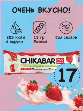 -22% 1 976 q 2 533 q 2 533 q 000 Протеиновый батончик Chikabar 17 батончика x 60 г, Клубника со сливками Chikalab В корзину Артикул 51108
