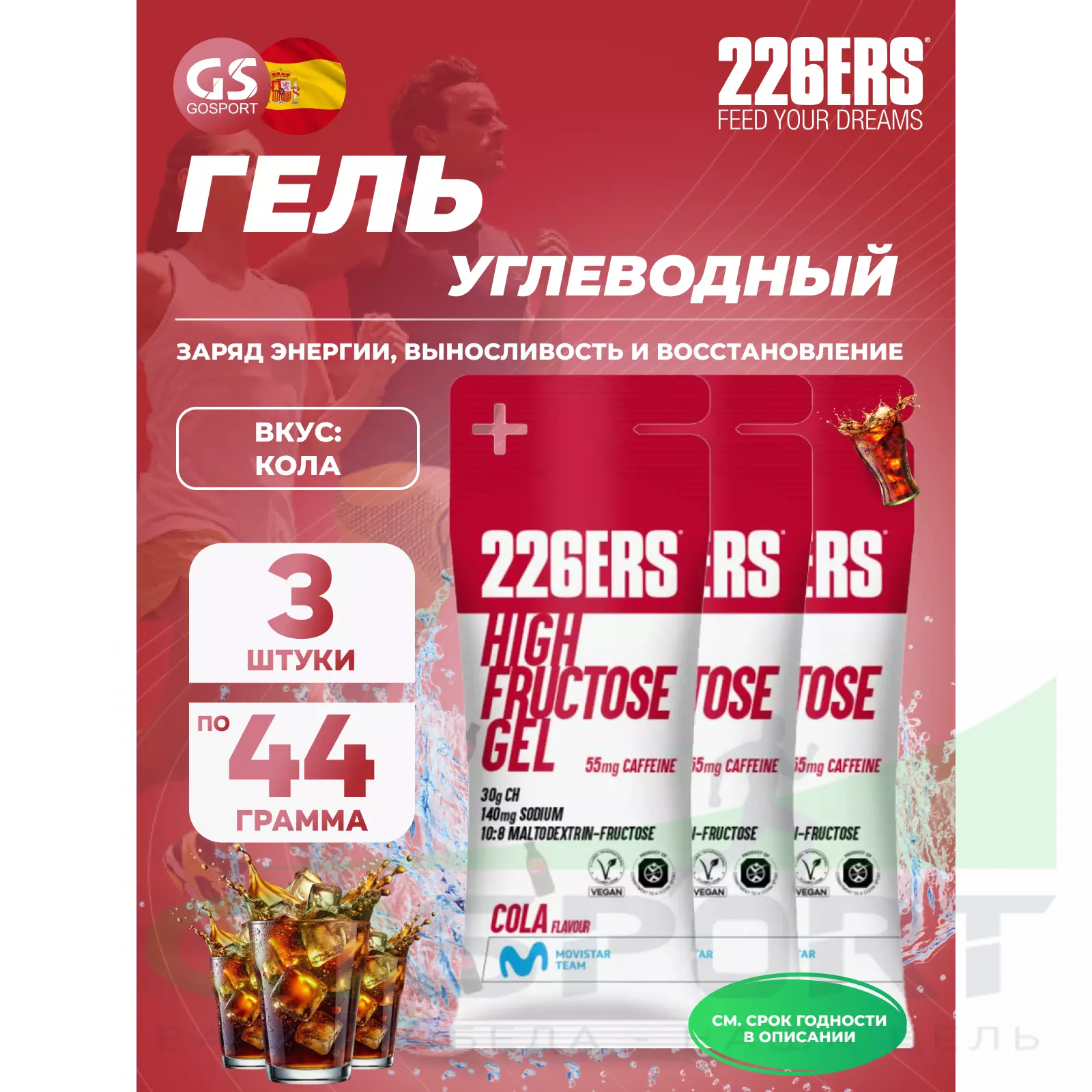 226ERS High Fructose Gel 250 mg + caffeine 55 mg 3 x 44 г, Кола — Быстрый заряд энергии и выносливость