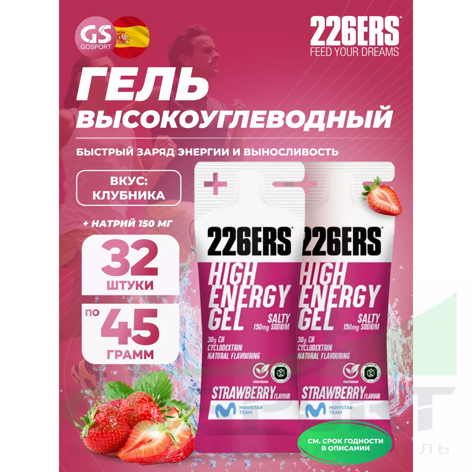 226ERS High Energy Gel + sodium 150 mg 32 x 45 г, Клубника — Быстрый заряд энергии и выносливость