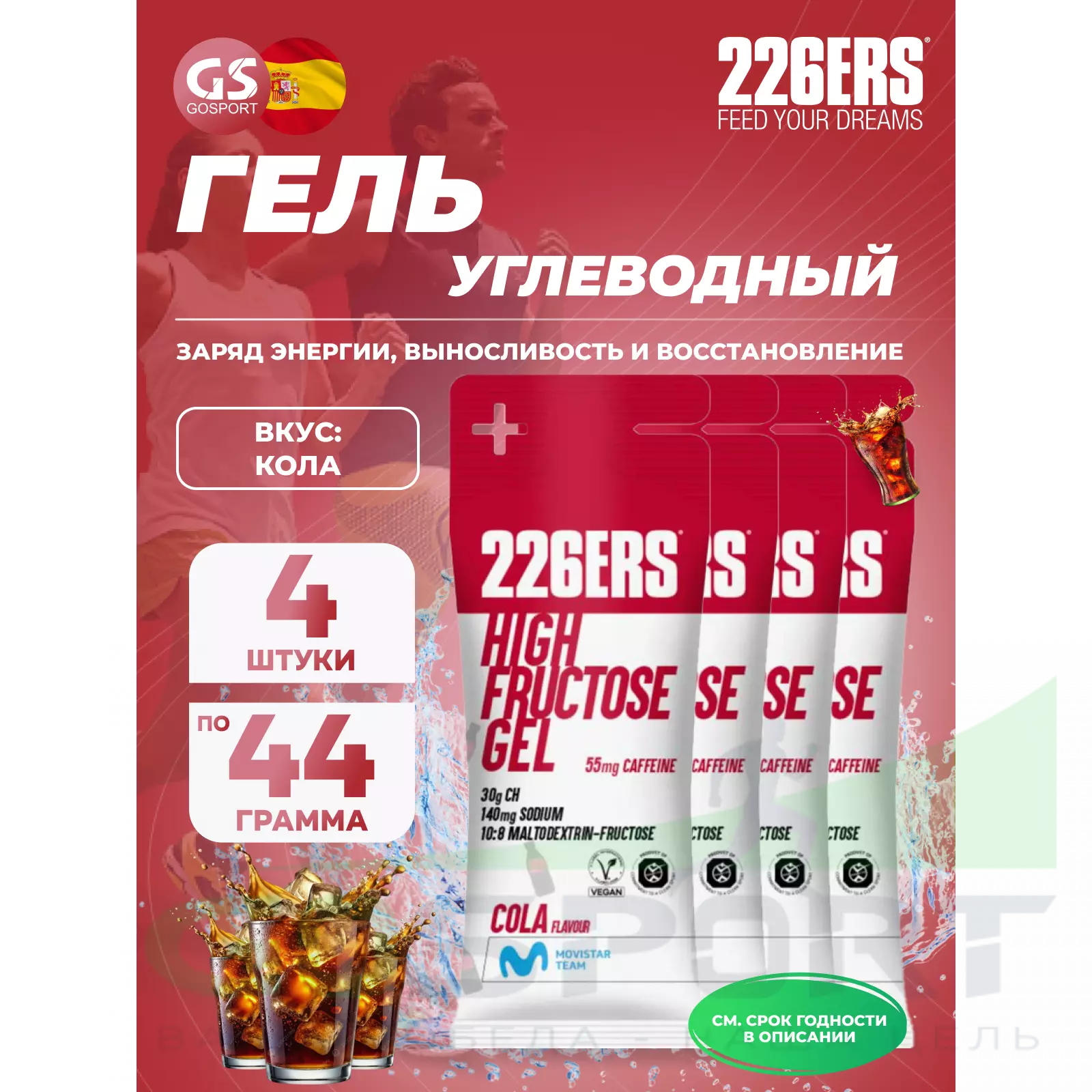 226ERS High Fructose Gel 250 mg + caffeine 55 mg 4 x 44 г, Кола — Быстрый заряд энергии и выносливость