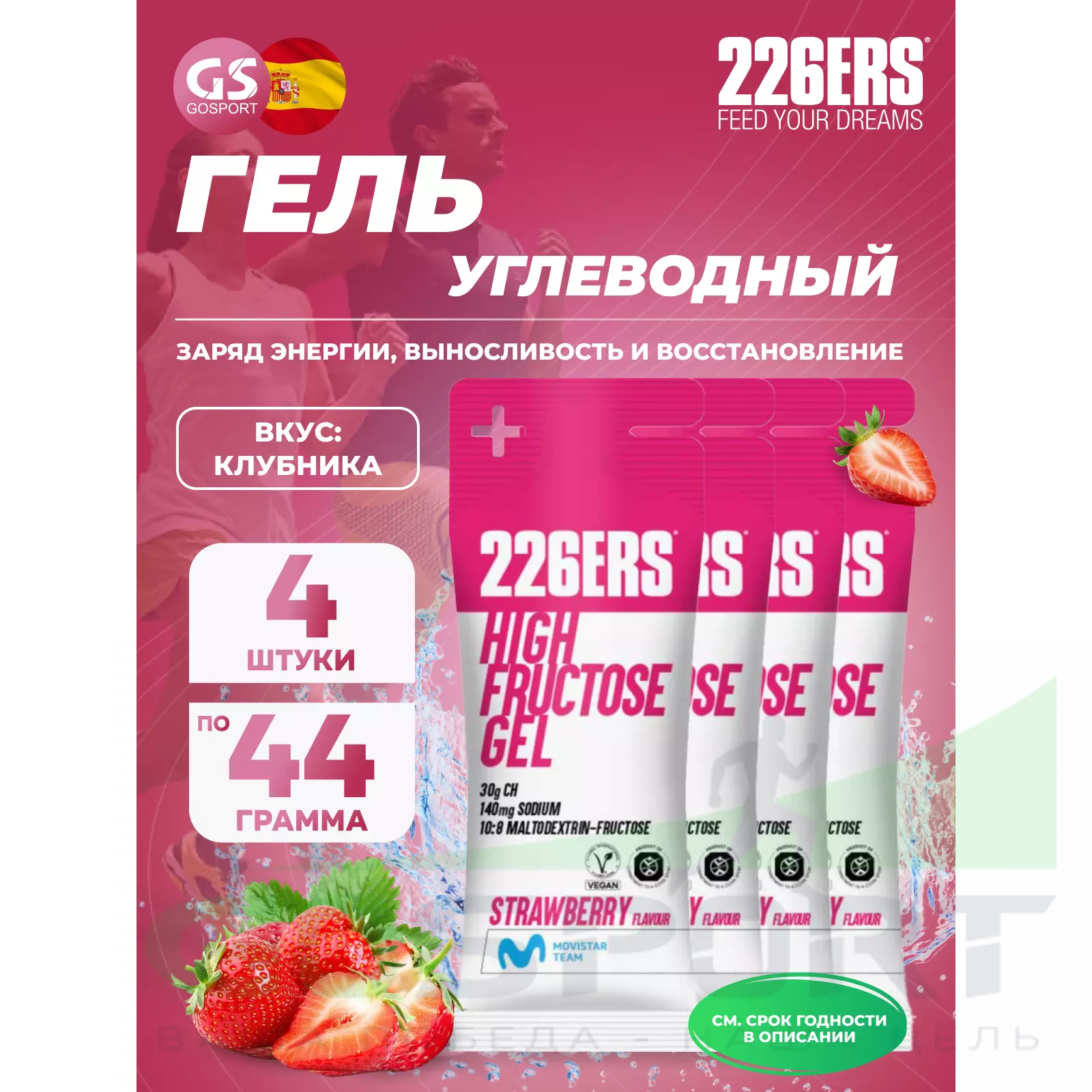 226ERS High Fructose Gel 140 mg 4 x 44 г, Клубника — Быстрый заряд энергии и выносливость