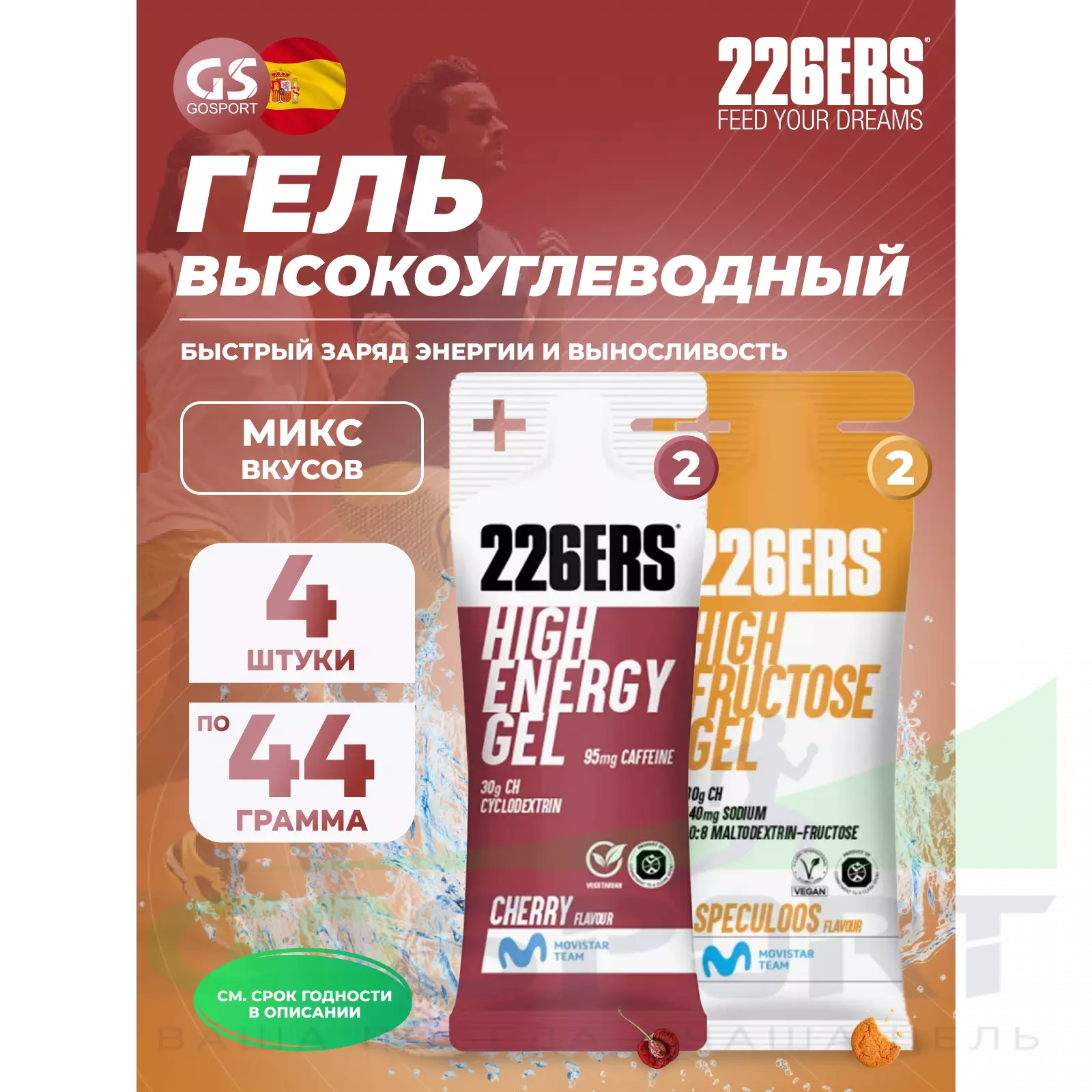 226ERS High Energy Gel + caffeine 95 mg 4 x 44 г, Микс 8 — Быстрый заряд энергии и выносливость