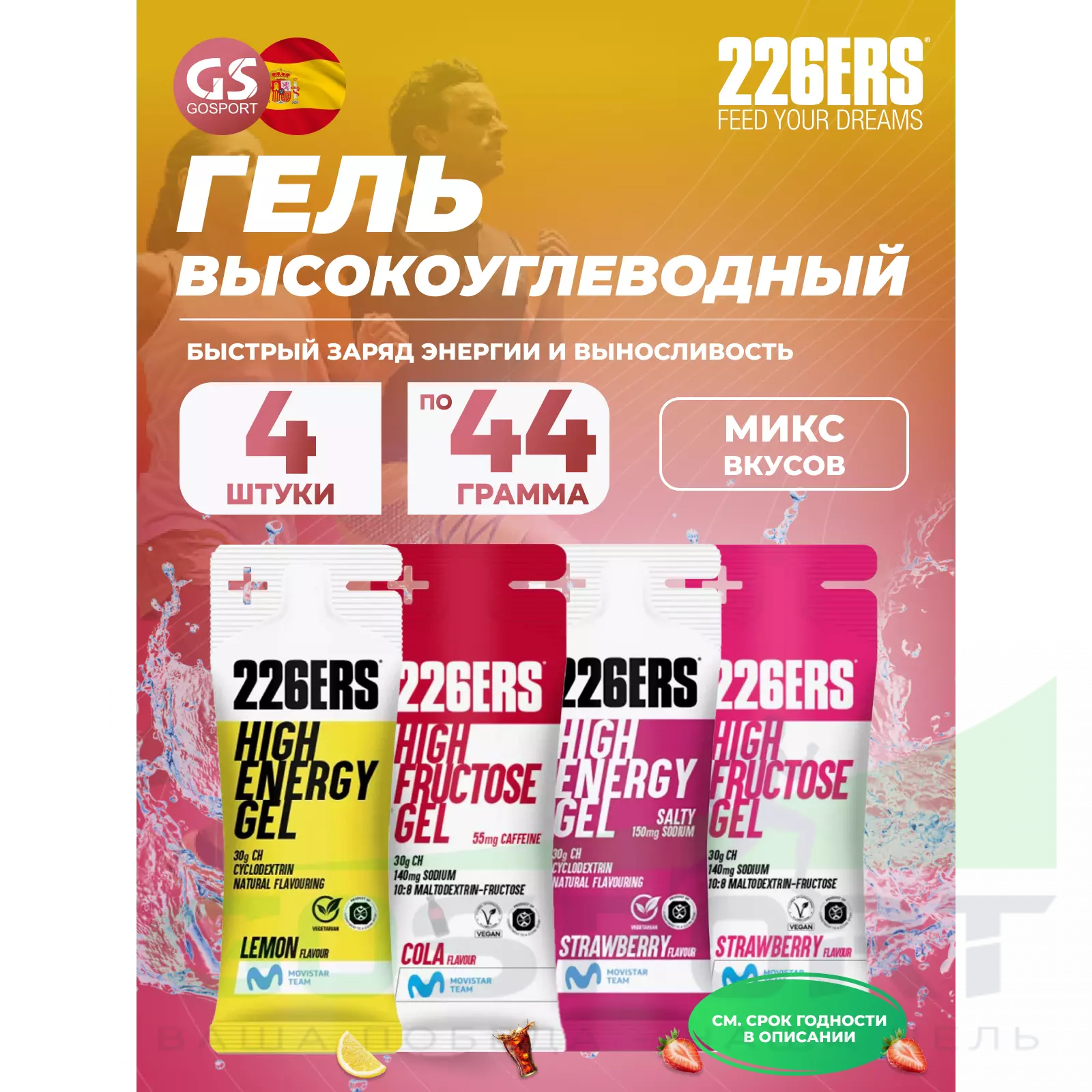 226ERS High Energy Gel + sodium 150 mg 4 x 44 г, Микс 12 — Быстрый заряд энергии и выносливость