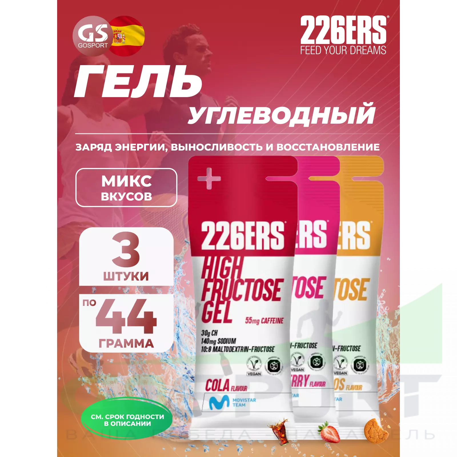 226ERS High Fructose Gel 250 mg + caffeine 55 mg 3 x 44 г, Микс 4 — Быстрый заряд энергии и выносливость