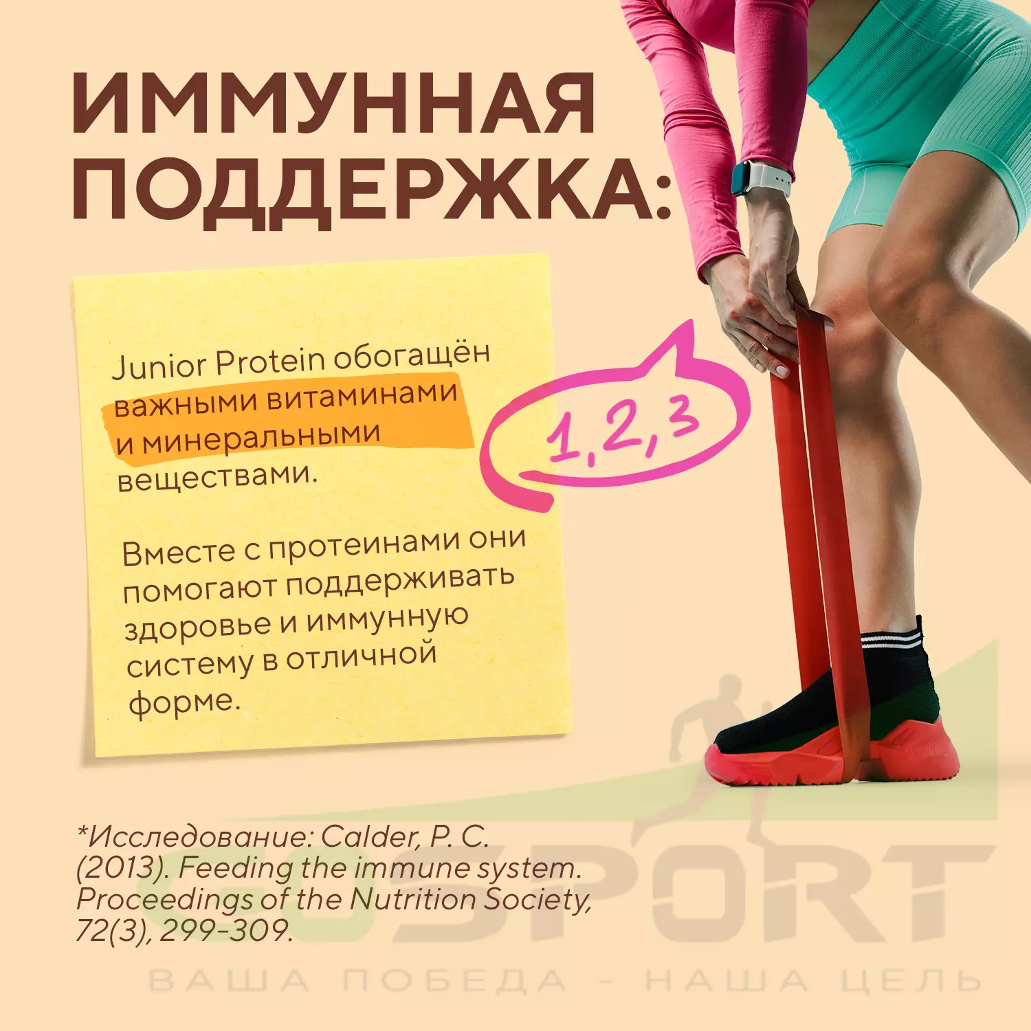 Витамины и минеральные вещества: Junior Protein обогащен важными витаминами и минеральными веществами, которые помогают поддерживать здоровье и иммунную систему вашего ребенка в отличной форме.