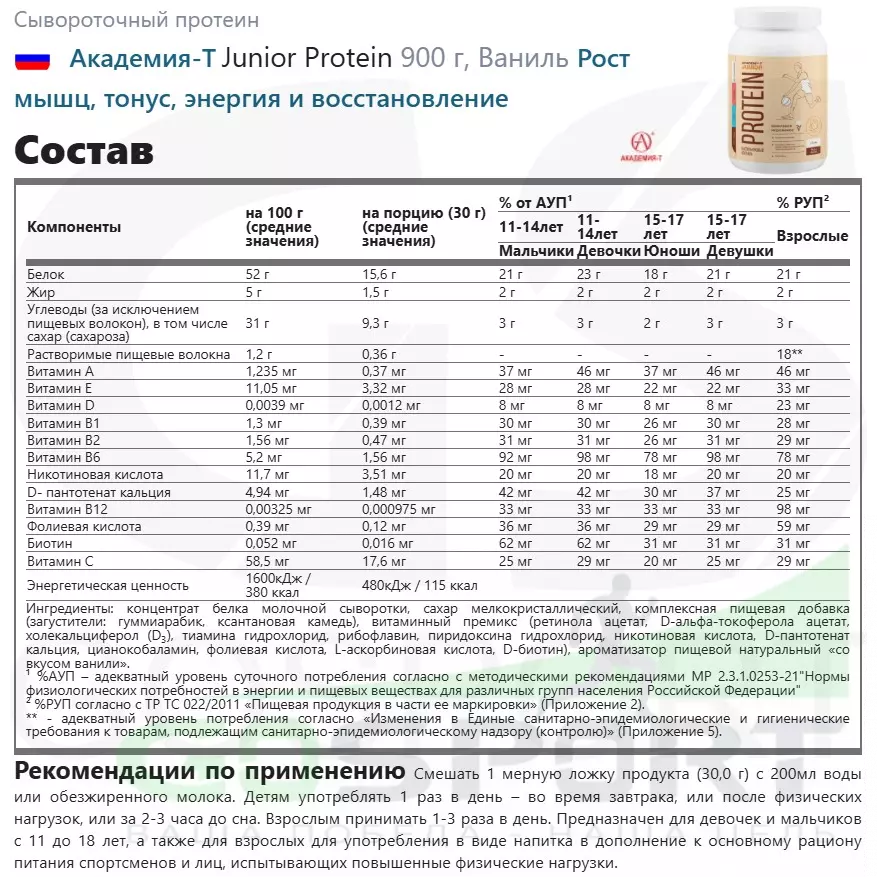 Академия-Т Junior Protein 900 г, Ваниль — Рост мышц, тонус, энергия и восстановление