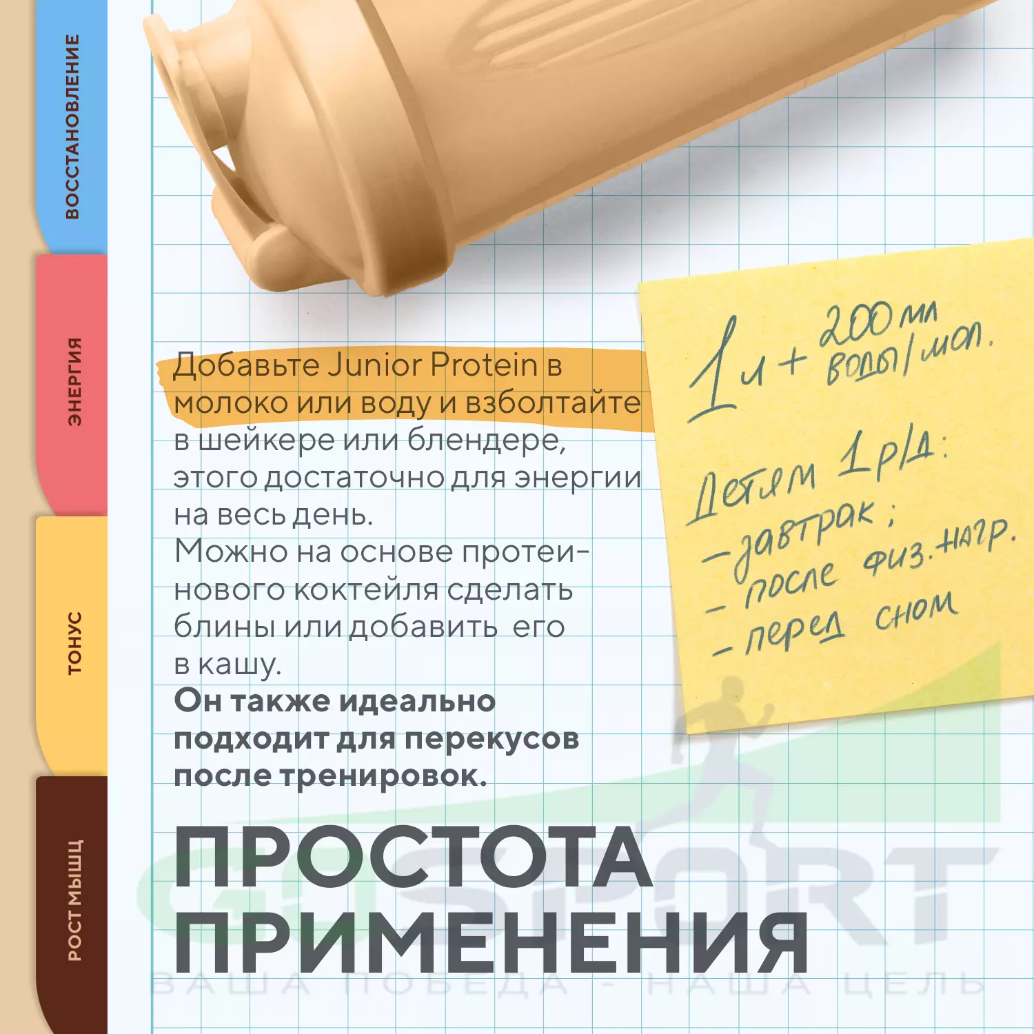 Простота использования: Добавьте Junior Protein в молоко или воду и взболтайте в шейкере или блендере, и ваш ребенок будет готов к активному дню. Можно на основе протеинового коктейля сделать блины или добавит его в кашу. Он также идеально подходит для перекусов после тренировок.