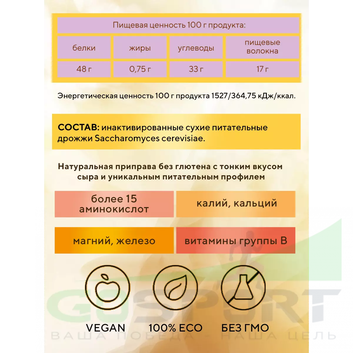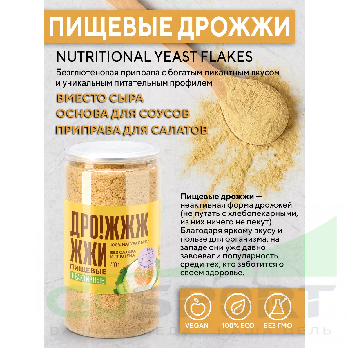 - Без ГМО, Без сахара, Без глютена