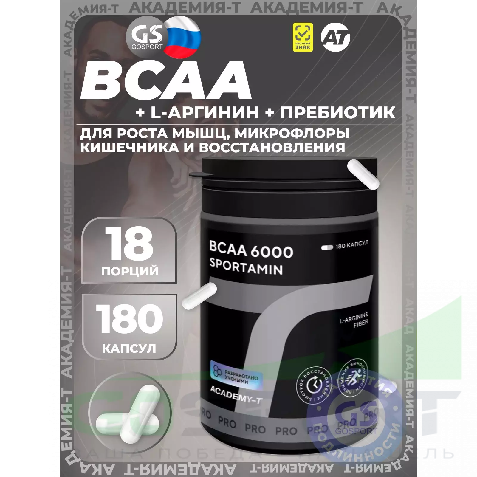 Академия-Т BCAA 6000 SPORTAMIN 180 капсул — Для роста мышц, микрофлоры кишечника и восстановления