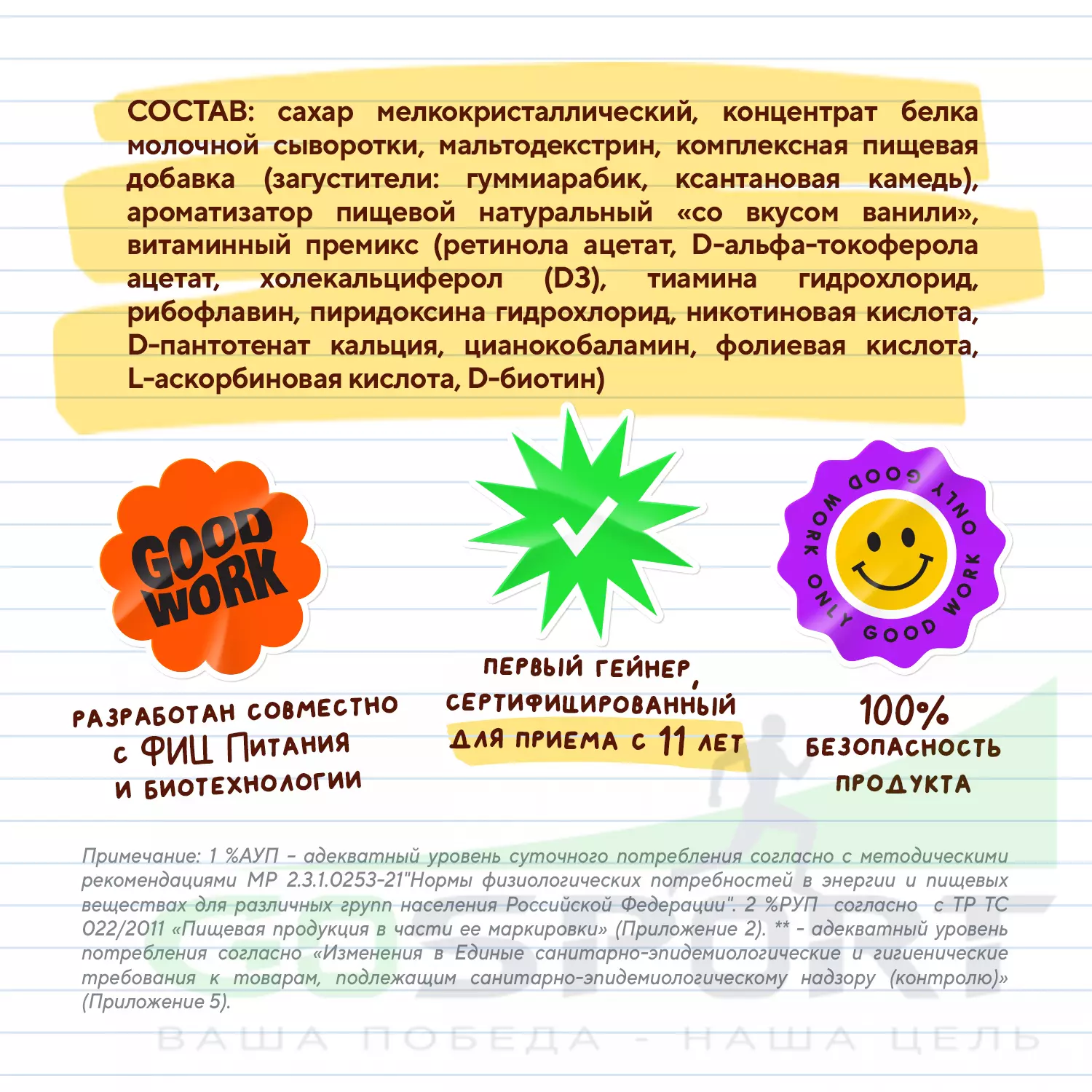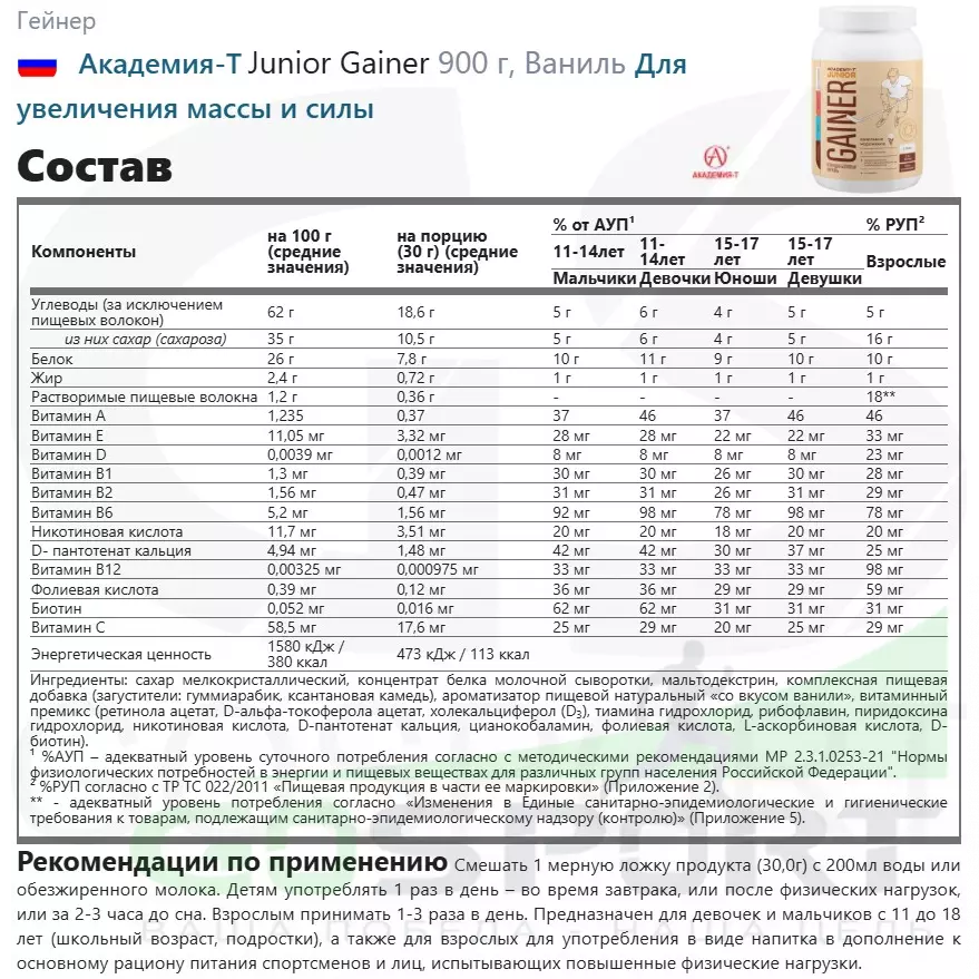 Доверие и качество: Junior Gainer разработан с использованием высоких стандартов качества и безопасности, которых компания Академия-Т придерживается уже почти 30 лет и более 14 лет поставляет спортивное питание в сборные России. Мы гордимся тем, что предлагаем продукт, на который можно полагаться.