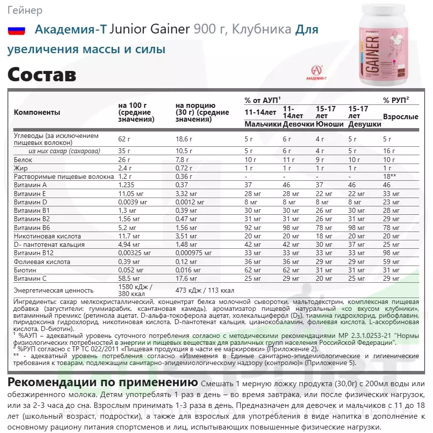 Доверие и качество: Junior Gainer разработан с использованием высоких стандартов качества и безопасности, которых компания Академия-Т придерживается уже почти 30 лет и более 14 лет поставляет спортивное питание в сборные России. Мы гордимся тем, что предлагаем продукт, на который можно полагаться.