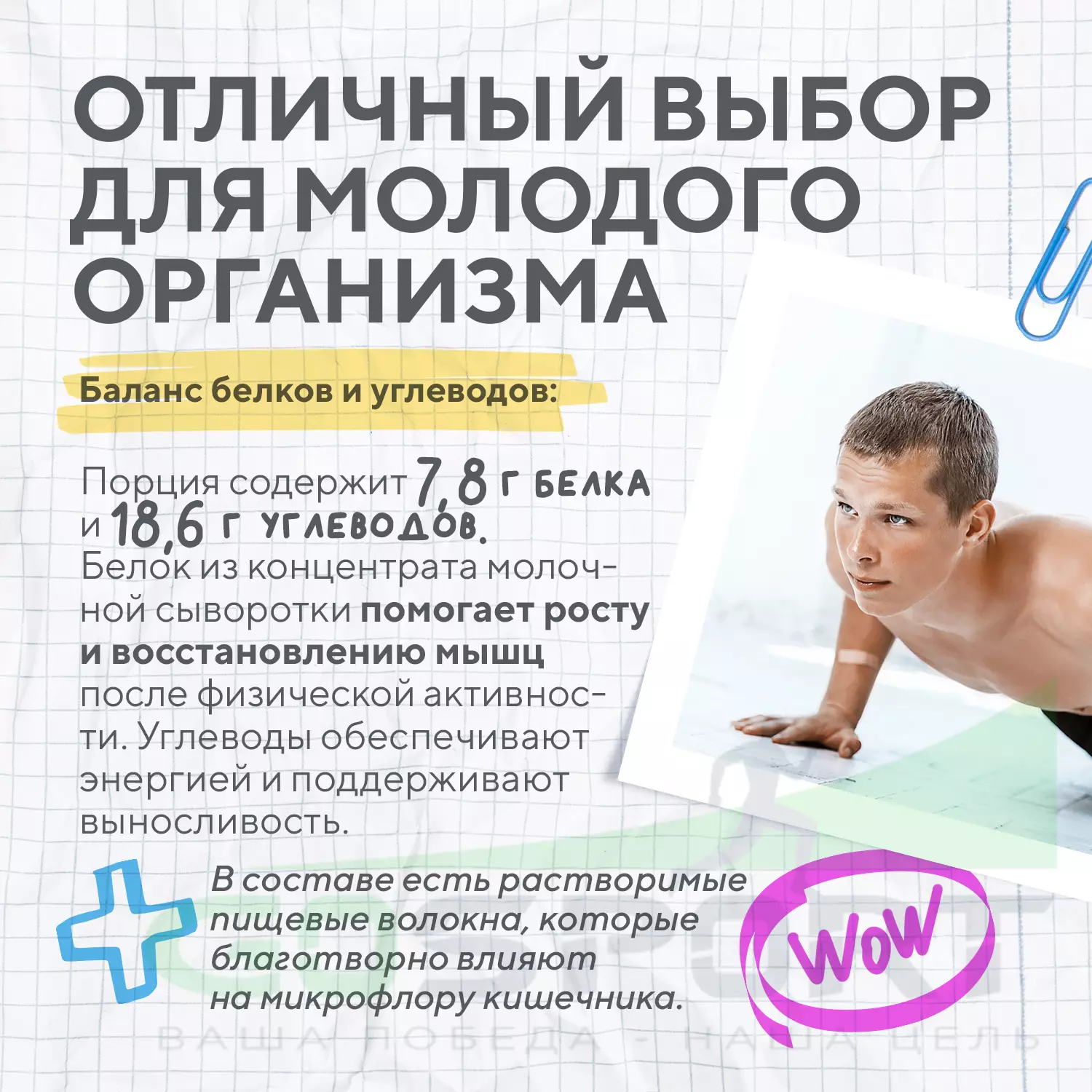 Баланс белков и углеводов: Junior Gainer содержит 7,8 г белка из концентрата молочной сыворотки в 1 порции, что способствует росту и восстановлению мышц после физической активности. Углеводы, в свою очередь обеспечивают энергией и поддерживают выносливость. При этом в составе есть растворимые пищевые волокна, которые благотворно влияют на микрофлору кишечника.
