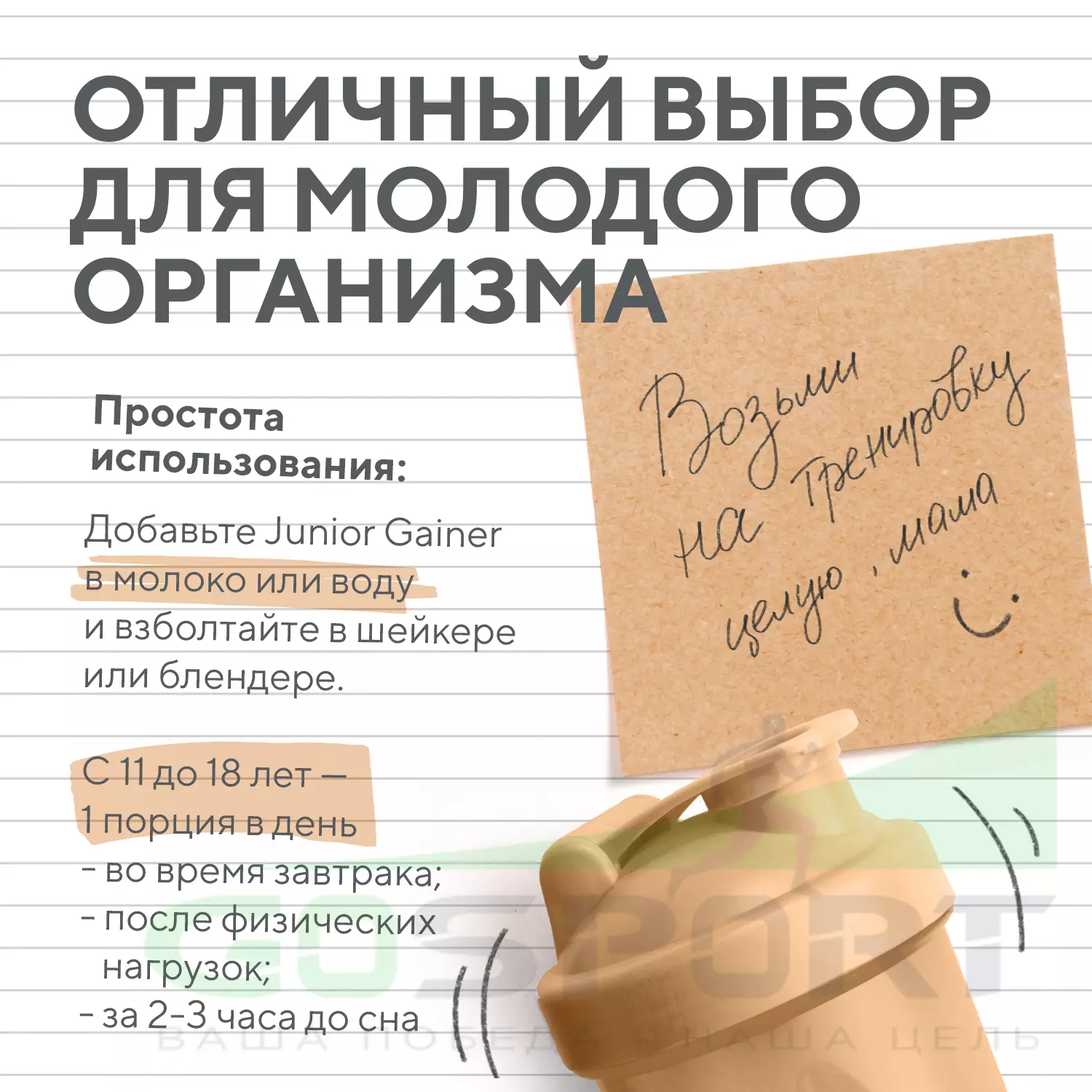 Простота использования: Добавьте Junior Gainer в молоко или воду и взболтайте в шейкере или блендере, и ваш ребенок будет готов к активному дню. Он также идеально подходит для перекусов после тренировок.