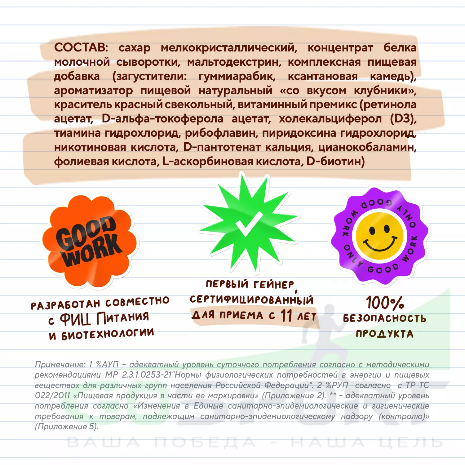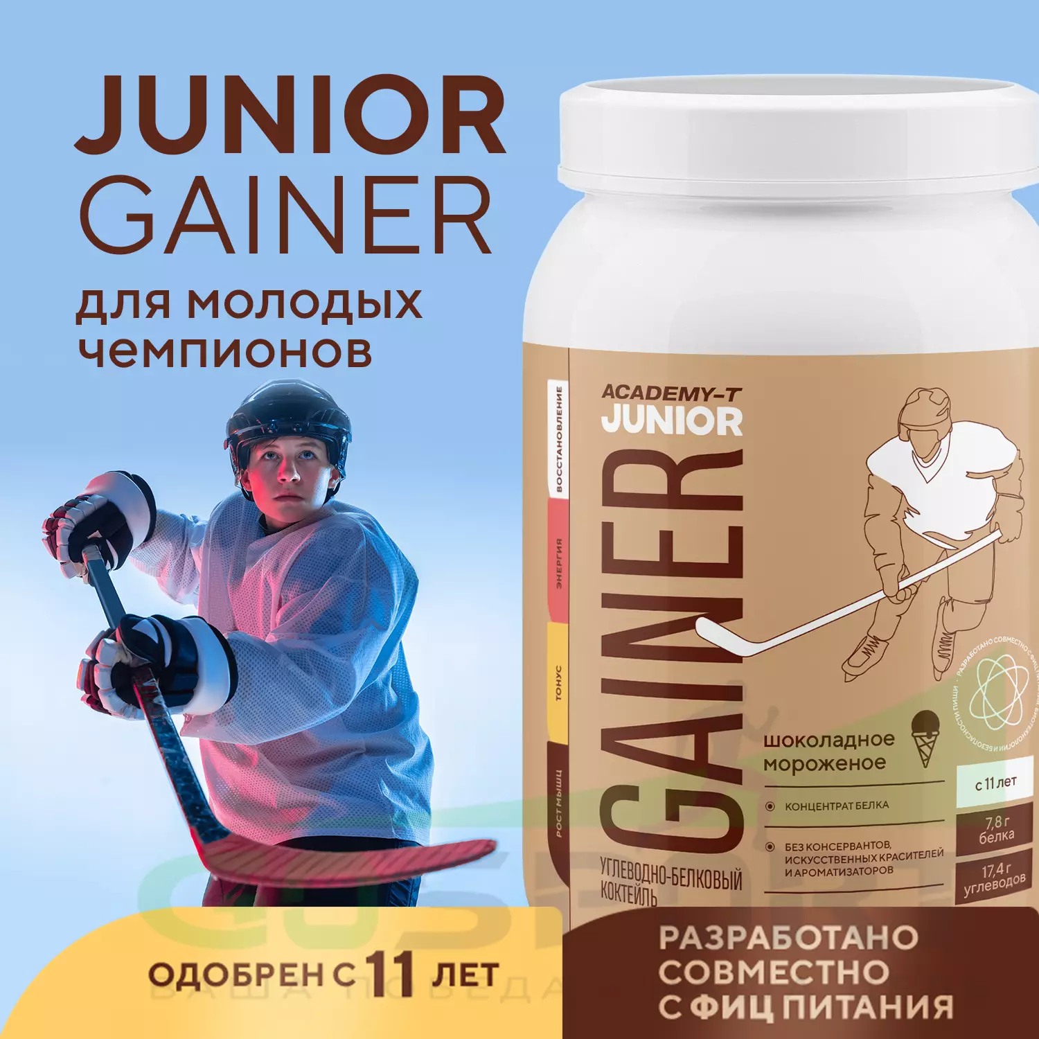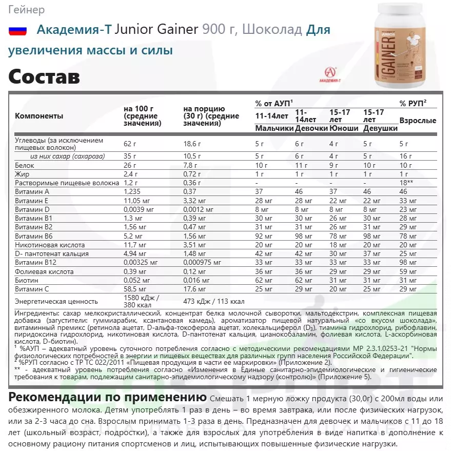 Доверие и качество: Junior Gainer разработан с использованием высоких стандартов качества и безопасности, которых компания Академия-Т придерживается уже почти 30 лет и более 14 лет поставляет спортивное питание в сборные России. Мы гордимся тем, что предлагаем продукт, на который можно полагаться.