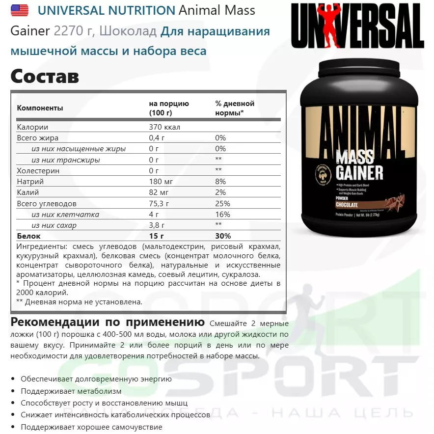 UNIVERSAL NUTRITION Animal Mass Gainer 2270 г, Шоколад — Для наращивания мышечной массы и набора веса