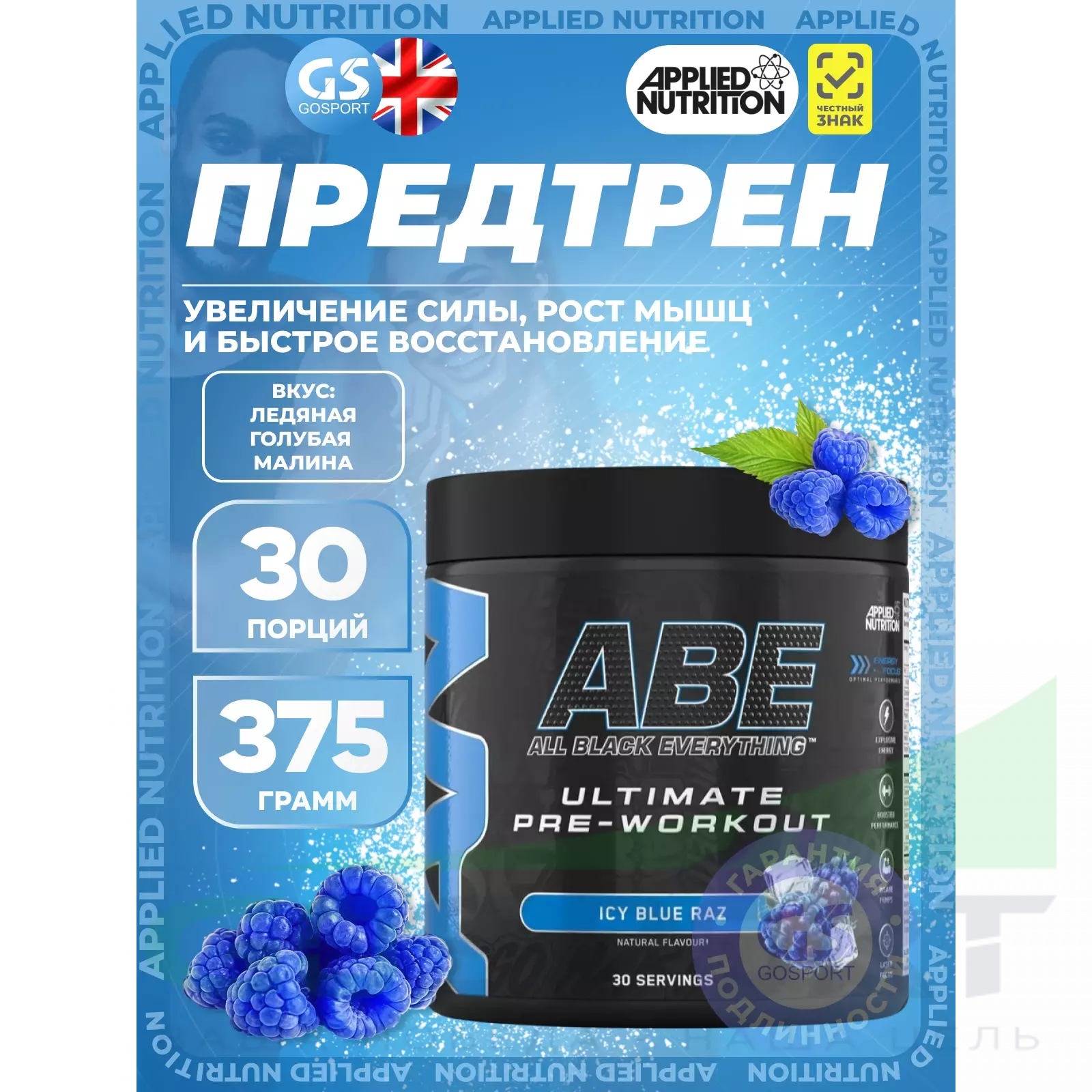 APPLIED NUTRITION ABE - Pre-Workout 375 г, Ледяная голубая малина — Увеличение силы, рост мышц и быстрое восстановление