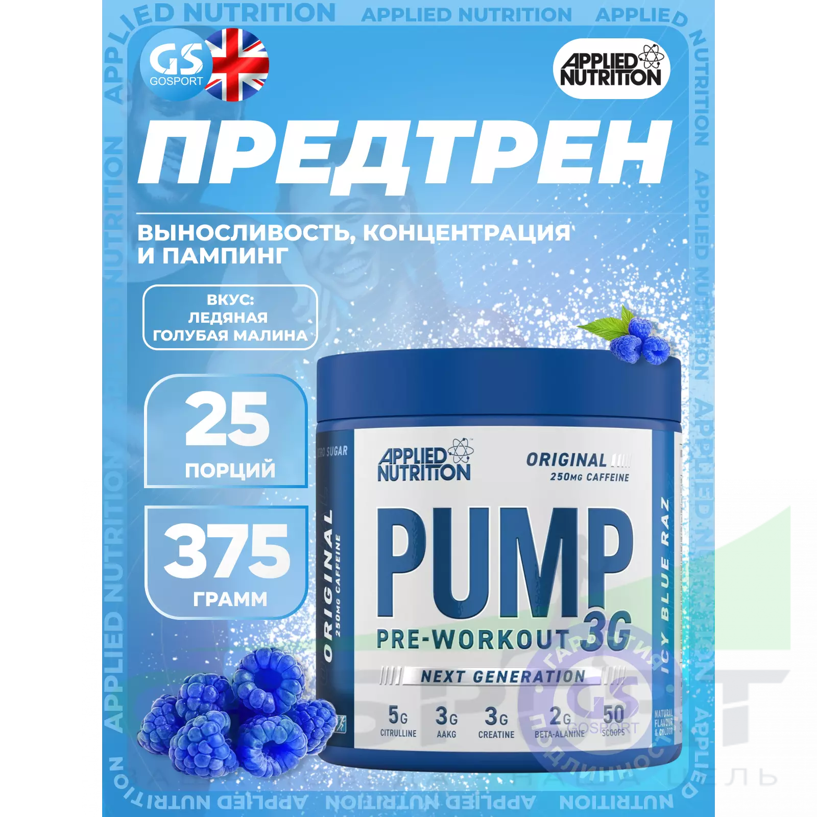 APPLIED NUTRITION Pump 3G Pre Workout 375 г, Ледяная голубая малина — Выносливость, концентрация и пампинг