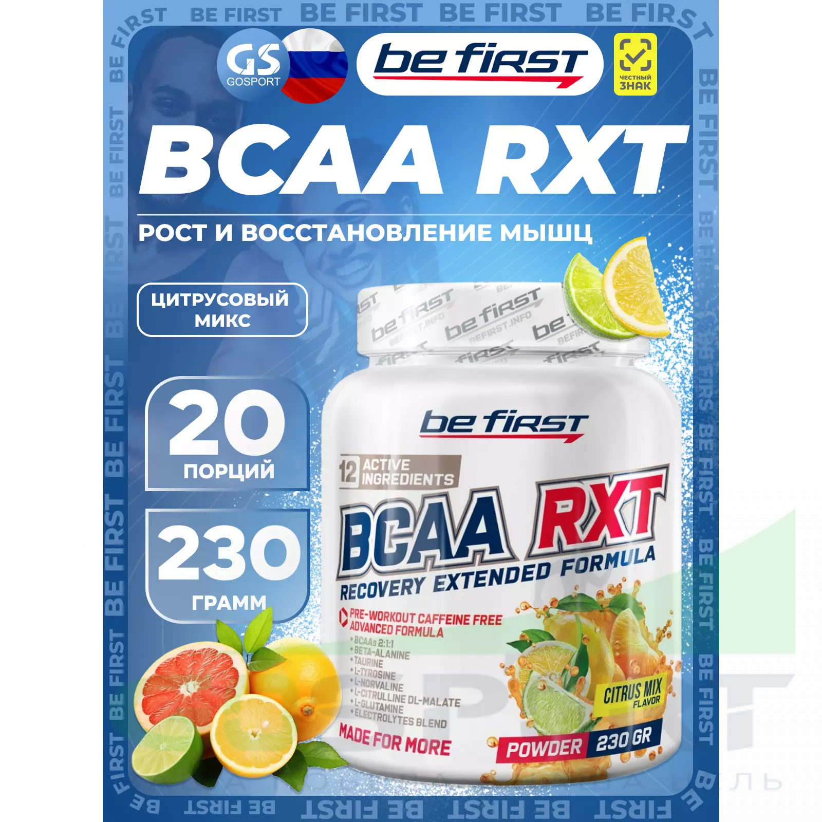 BCAA RXT Powder от Be First - это комплекс незаменимых аминокислот, формула которого специально расширена для более эффективного восстановления после тренировок. Входящие в состав лейцин, изолейцин и валин подавляют катаболизм и стимулируют рост мышц, глютамин дает питание мышечным клеткам и поддерживает иммунитет, который всегда страдает во время тренировок. Смесь электролитов восстанавливает баланс организма, обеспечивая регидратацию и оптимальную скорость обмена веществ. Цитруллин и норвалин улучшают кровообращение в мышцах, усиливают пампинг, повышают снабжение тканей кислородом и выведение вредных продуктов работы, например, лактата, повреждающего мышцы. А бета-аланин увеличивает концентрацию карнозина, препятствующего закислению мышц во время работы, уменьшающего степень повреждения мышечных волокон и стимулирующего восстановление.