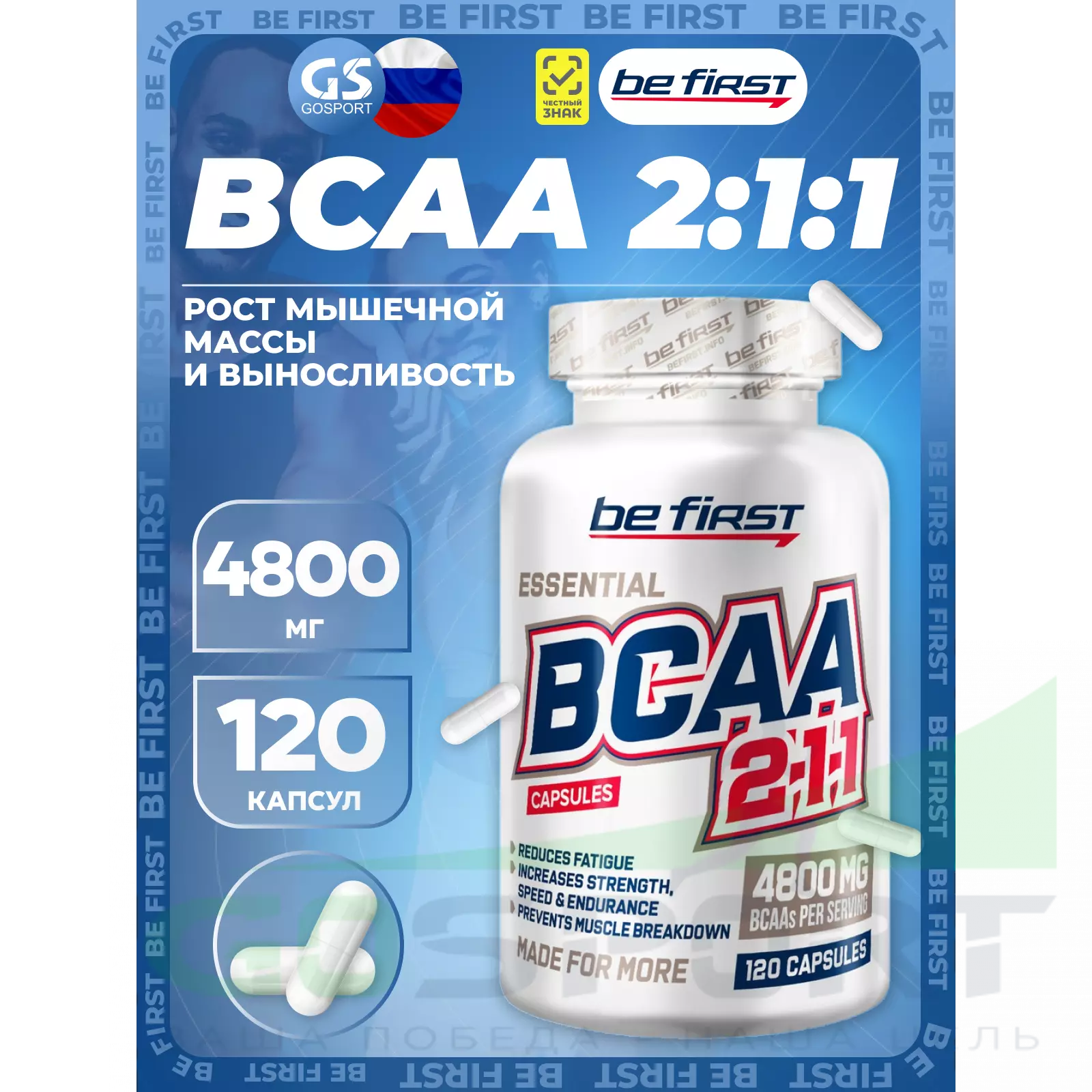 Be First BCAA 2:1:1 Capsules - комплекс из 3 незаменимых аминокислот: L-лейцин, L-изолейцин, L-валин в классическом соотношении 2:1:1 в удобной для приема капсулированной форме.