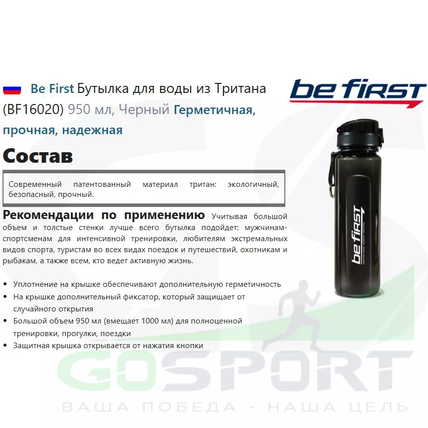 Be First Бутылка для воды из Тритана (BF16020) 950 мл, Черный — Герметичная, прочная, надежная
